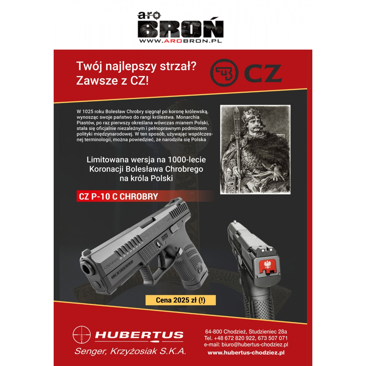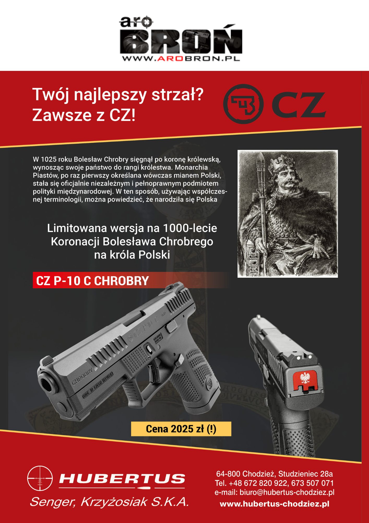 CZ P-10C "Chrobry" to limitowana edycja popularnego pistoletu CZ P-10C w kalibrze 9 × 19 mm, przygotowana w liczbie zaledwie 1000 sztuk. Edycja ta została stworzona z myślą o pasjonatach historii oraz kolekcjonerach — łączy nowoczesne rozwiązania technologiczne z unikalnym wyglądem inspirowanym postacią legendarnego księcia Bolesława Chrobrego.