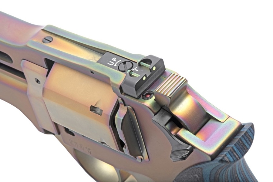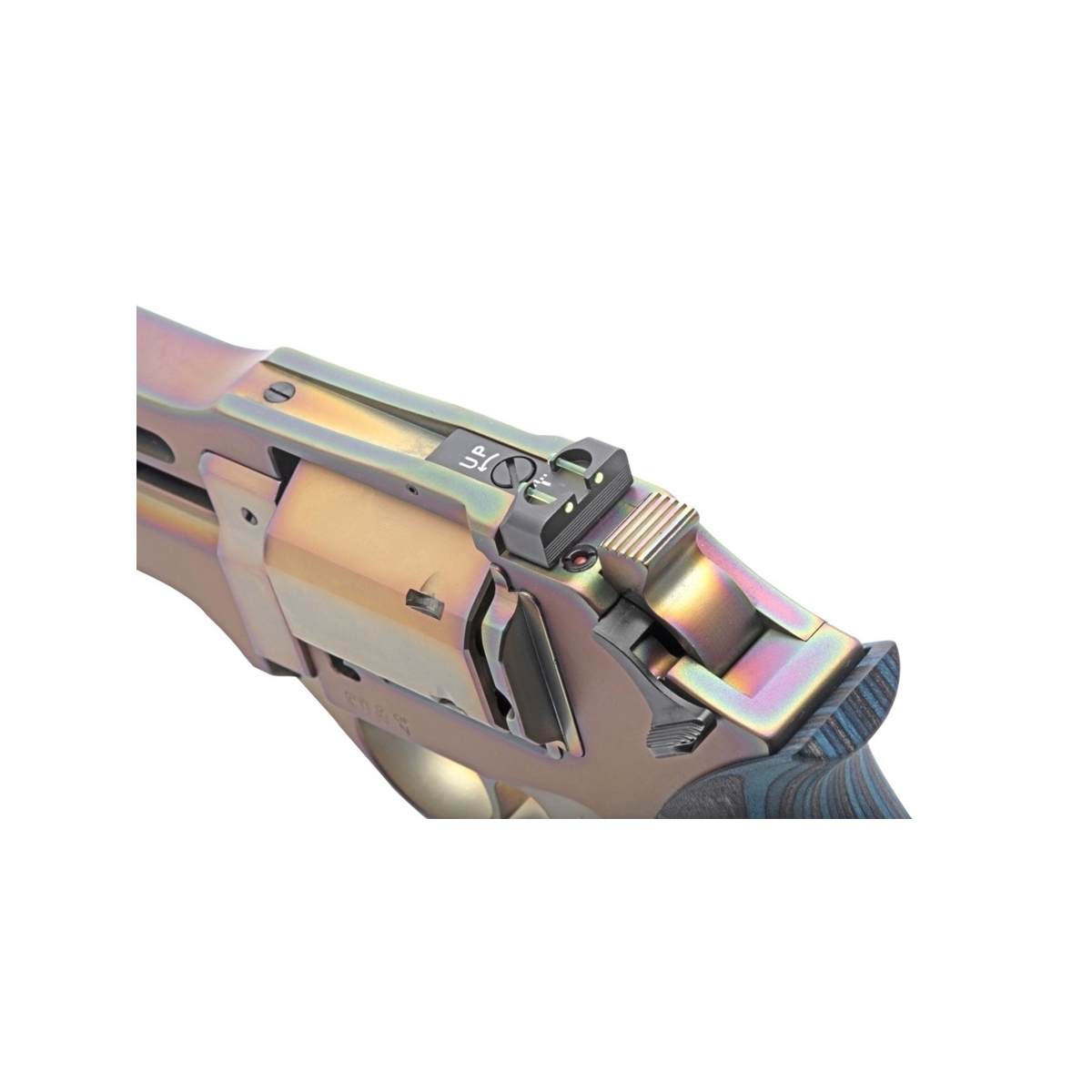 Rhino 60DS to rewolwer o długości lufy 6 cali, co zapewnia doskonałą równowagę między precyzją a manewrowością. Taka długość lufy pozwala na bardziej precyzyjne celowanie, jednocześnie zachowując wygodę użytkowania. Model ten został zaprojektowany z myślą o strzelcach, którzy cenią sobie zarówno funkcjonalność, jak i estetykę, co widoczne jest w jego unikalnym wykończeniu "Nebula". Powłoka broni Rainbow PVD, zmieniającego barwy od fioletu przez złoto aż po niebieski, sprawia, że Rhino 60DS Nebula wyróżnia się na tle innych rewolwerów, nadając mu futurystyczny i wyjątkowy wygląd.