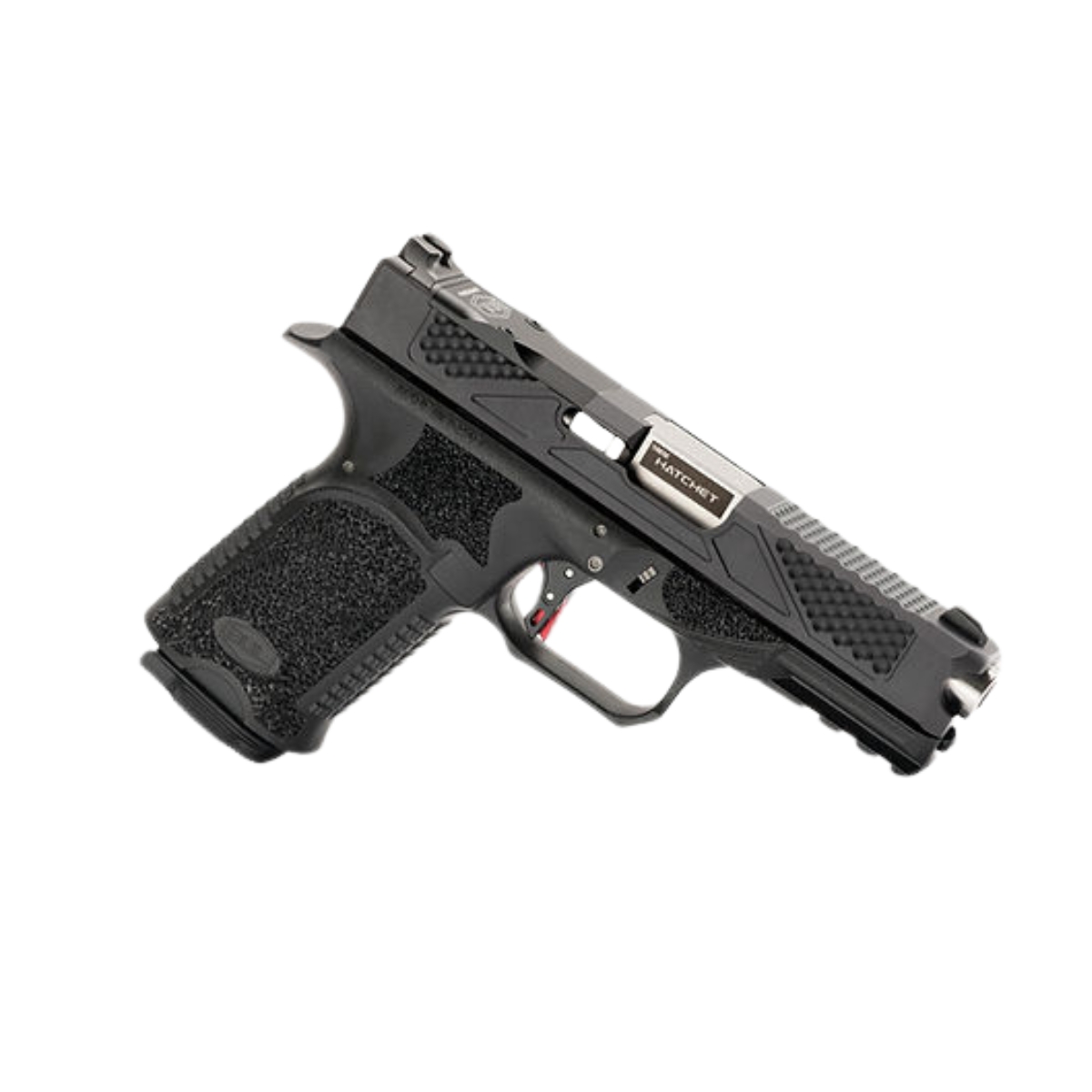 - Kaliber i lufa: 9x19 mm, z lufą o długości 4,02 cala (102 mm) z charakterystycznymi nacięciami Hatchet serrations, które poprawiają chwyt i ułatwiają szybkie przeładowanie.