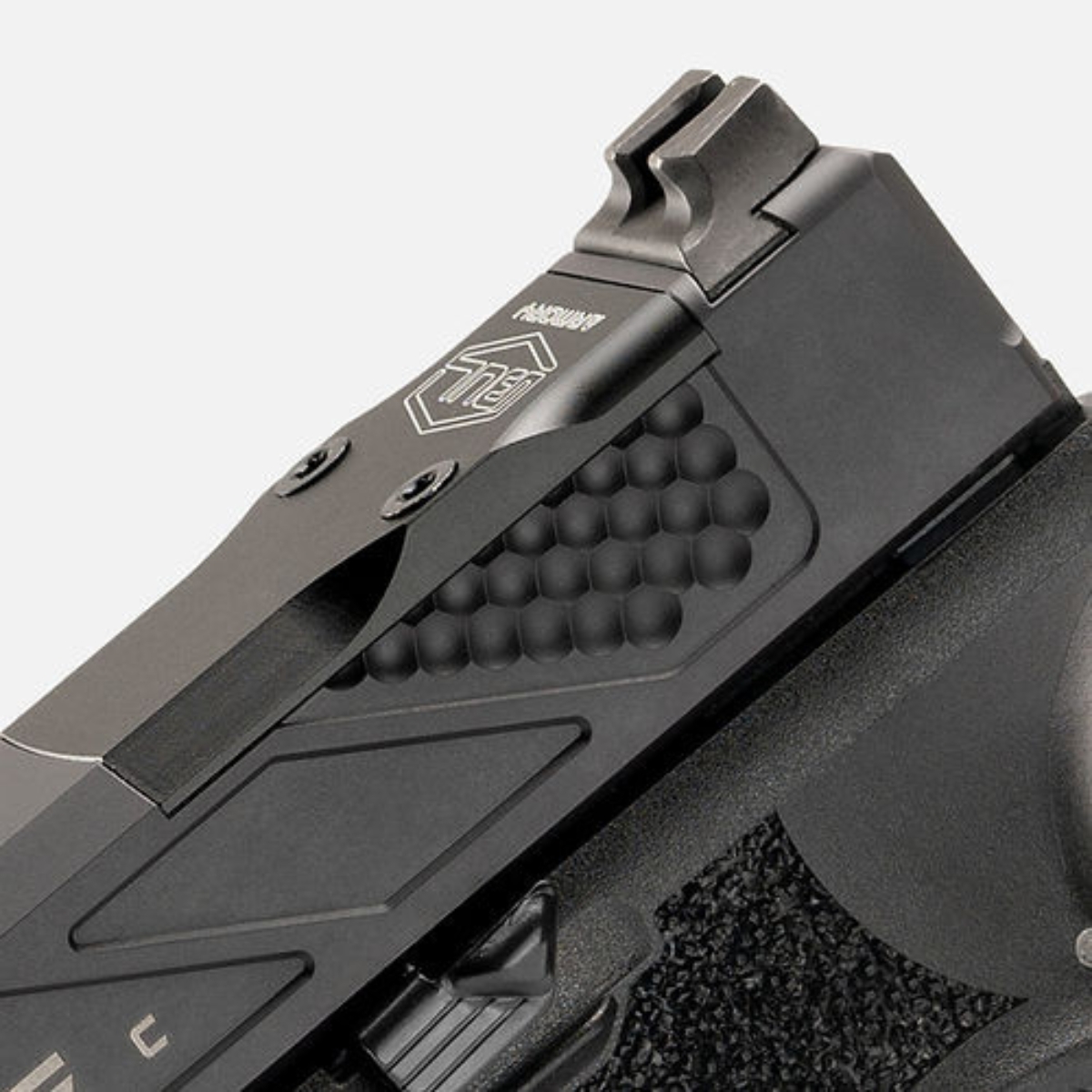 - Ergonomia i obsługa: Zastosowanie wysokiego grzbietu chwytu (beavertail), rozszerzonego magwella z bocznymi wycięciami, a także podwójnego podcięcia osłony spustu zapewnia wygodny i pewny chwyt. Odwracalny przycisk zwalniania magazynka oraz obustronny thumb rest zwiększają komfort użytkowania.