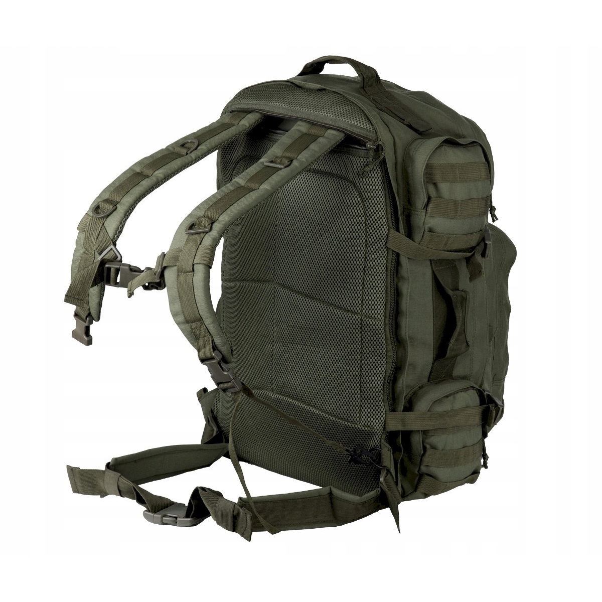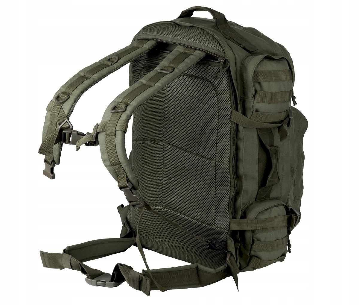 - System MOLLE/PALS na kieszeniach i szelkach, umożliwiający modularne powiększenie plecaka i podpięcie narzędzi.