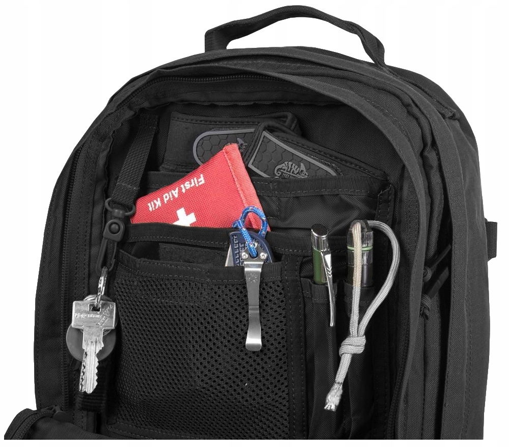 - Duża kieszeń zewnętrzna z organizerem (na mapy, noże, latarki, magazynki)