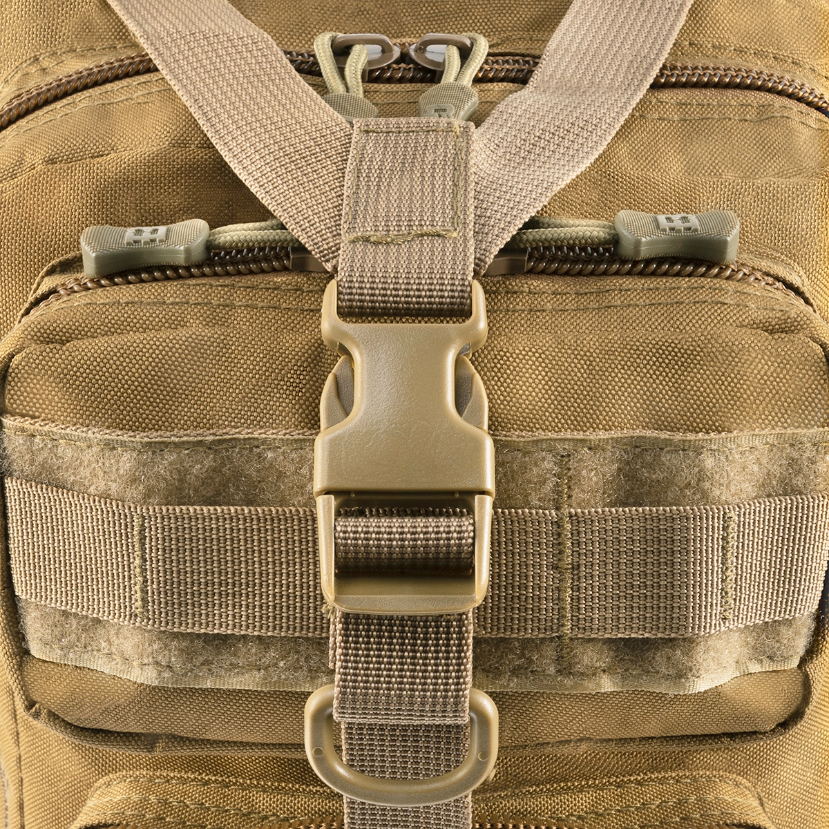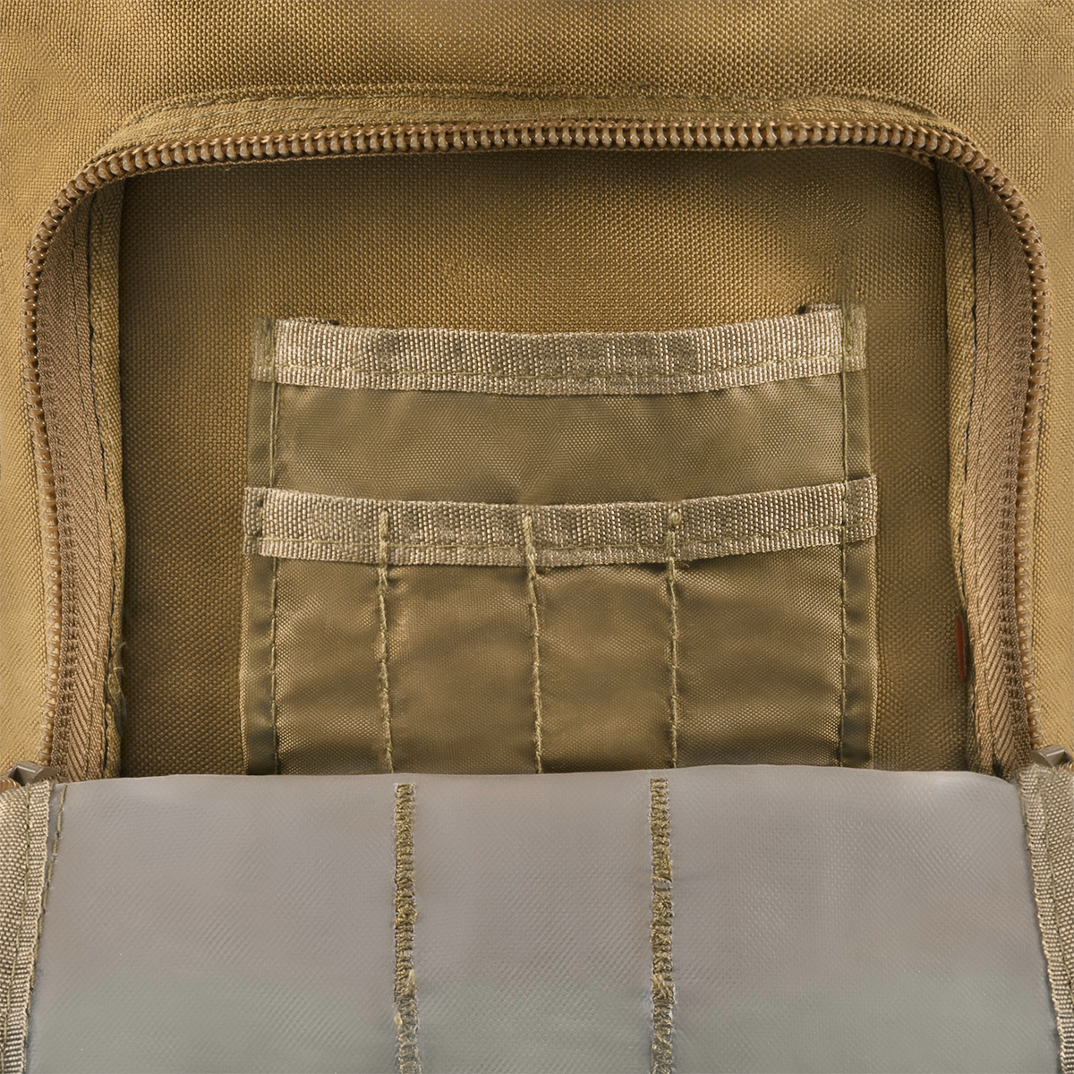 Na powierzchni plecaka naszyte zostały taśmy kompatybilne z systemem MOLLE pozwalające na powiększenie pojemności przez przyczepienie dodatkowych ładownic czy kieszeni.