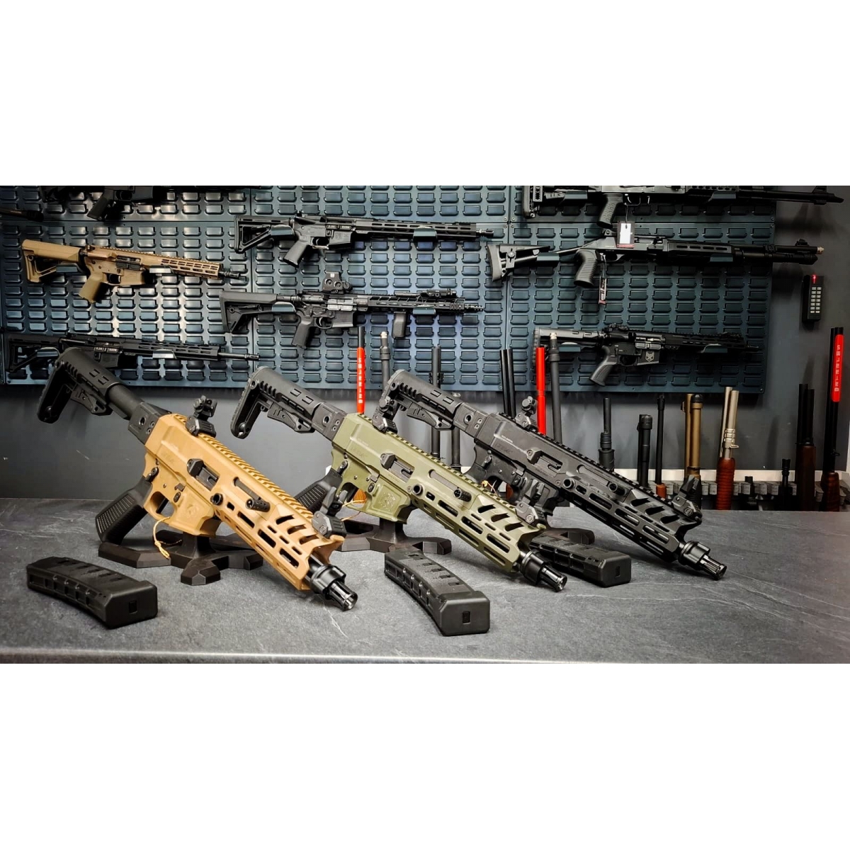 - Szyna montażowa: Picatinny – górna, boczne i dolna (z osłonami szyn)