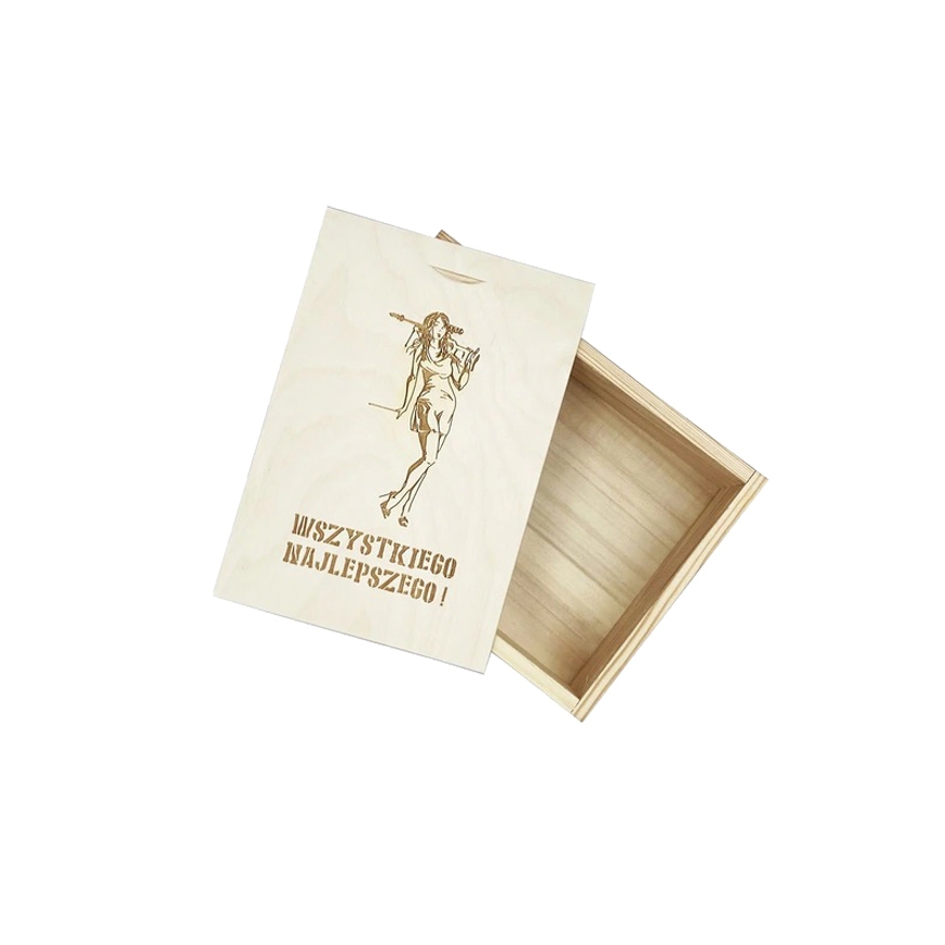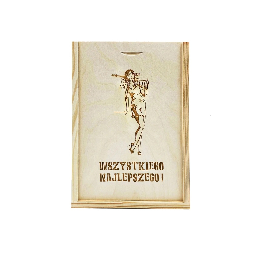 Pudełko drewniane 14x19 cm - pudełko zasuwane, wyprodukowane w Polsce. Wieczko posiada grawer z motywem kobiety z bronią. Pudełko wykonane z drewna sosnowego oraz sklejki liściastej. Wymiary wewnętrzne: