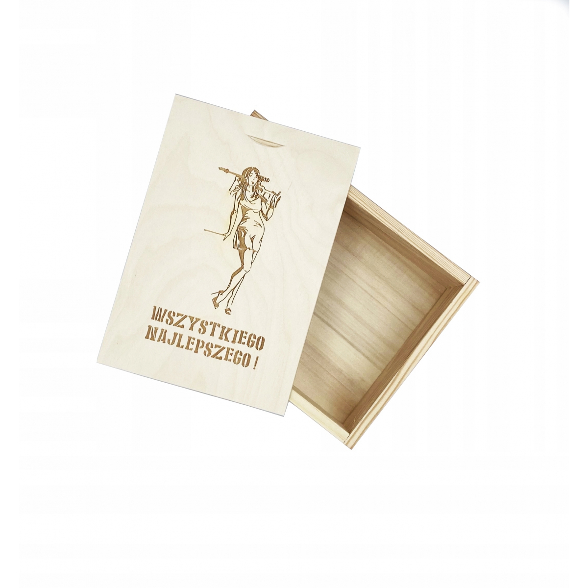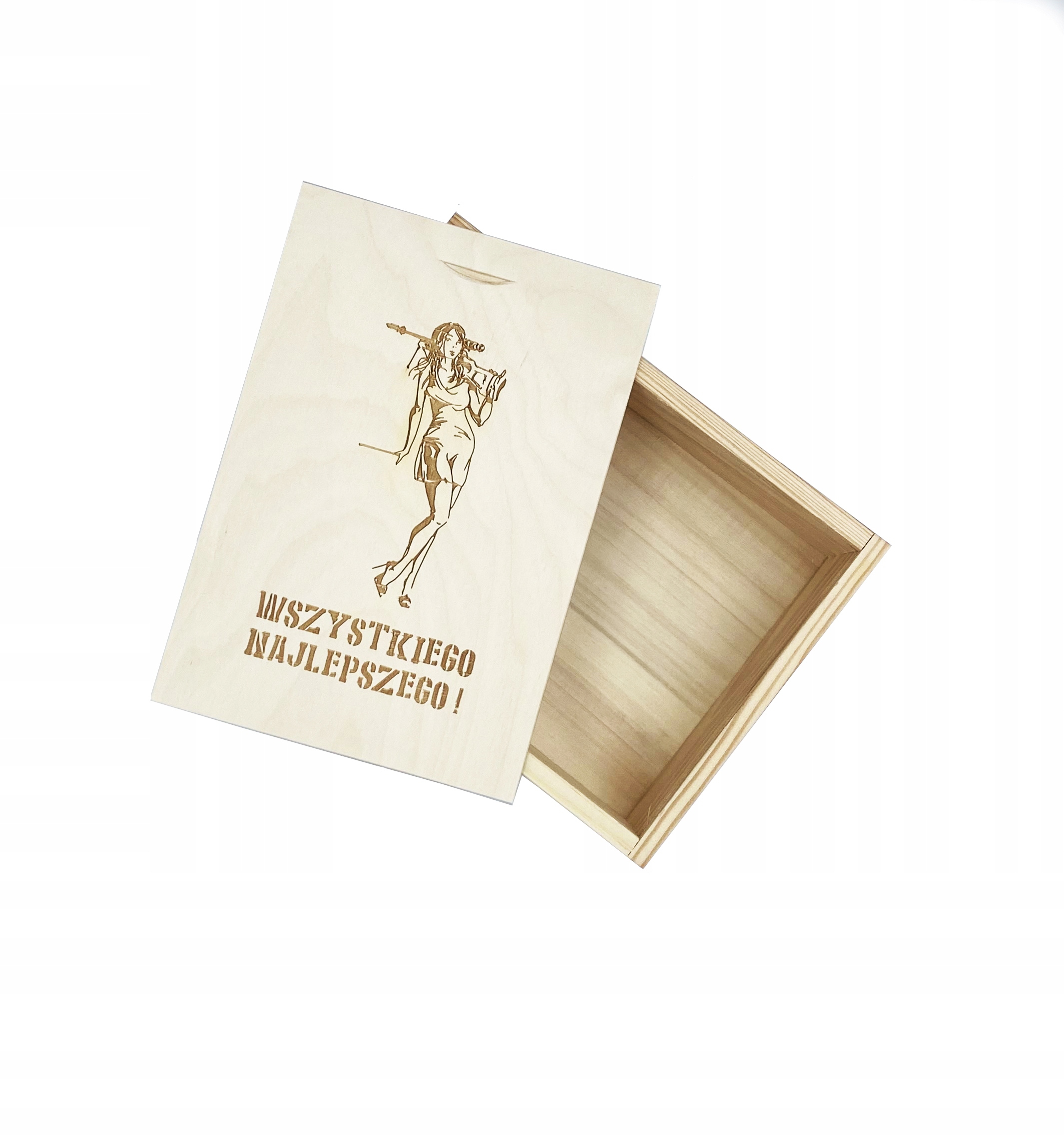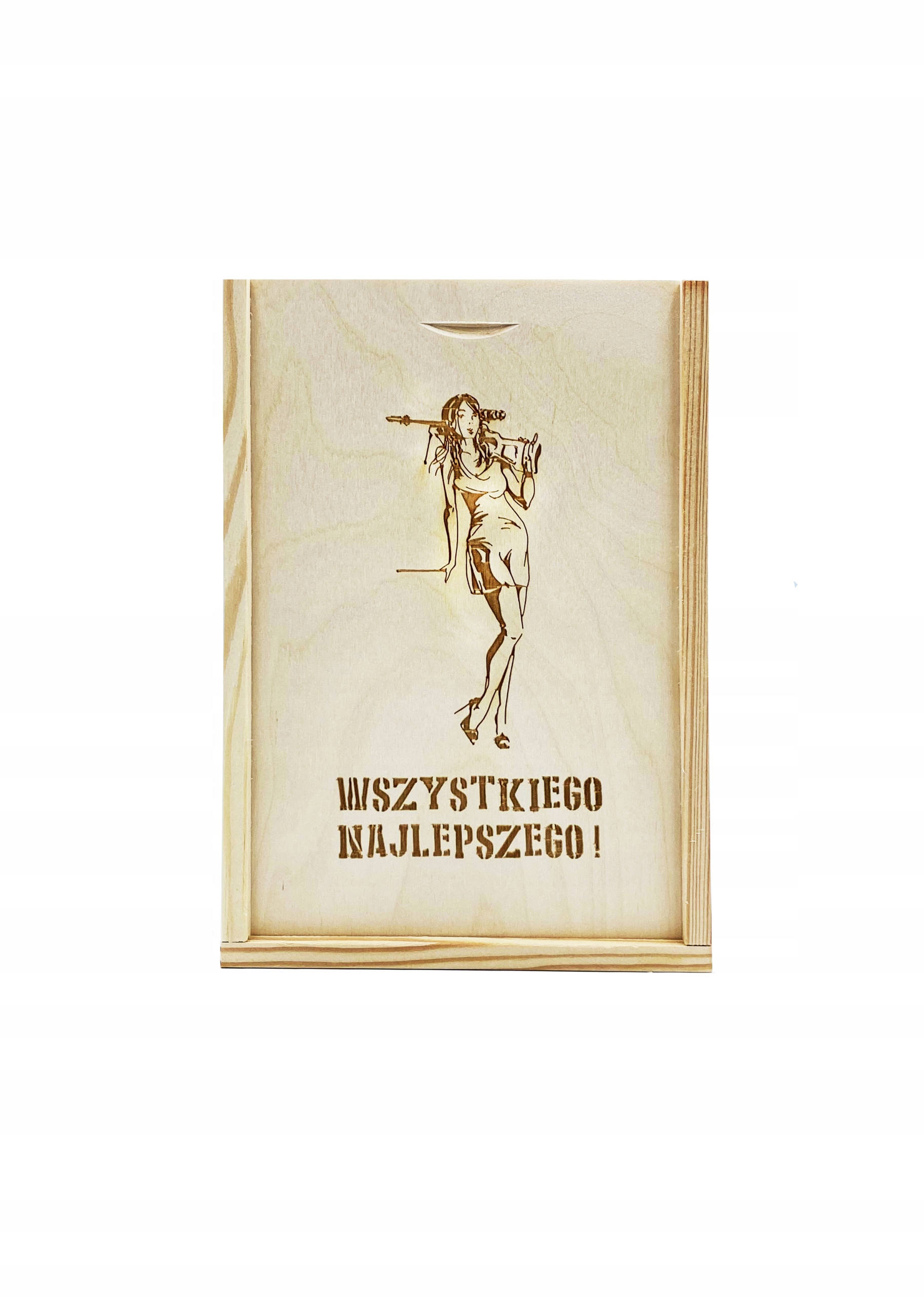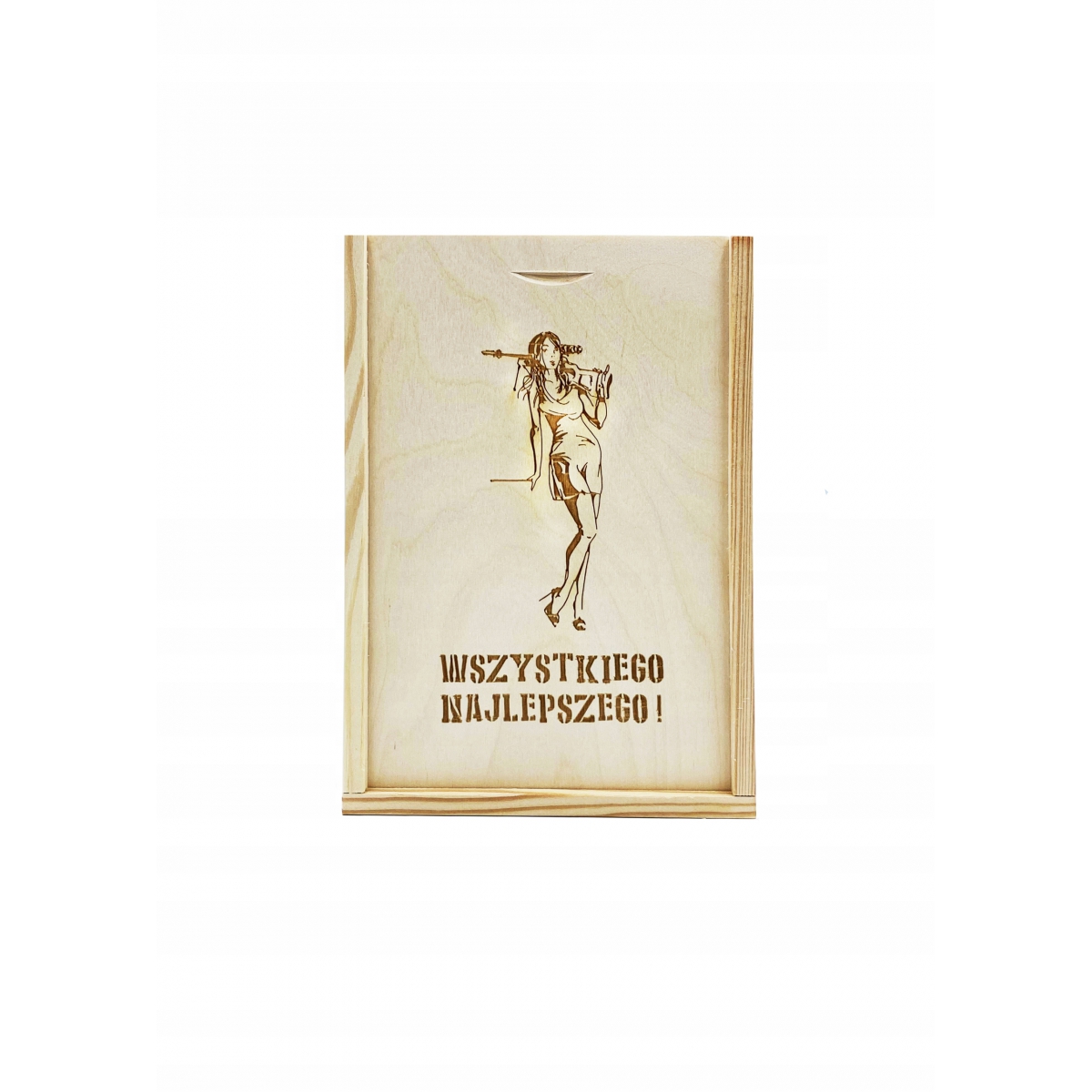 Pudełko drewniane 8,5x12,8 cm - pudełko zasuwane, wyprodukowane w Polsce. Wieczko posiada grawer z motywem kobiety z bronią. Pudełko wykonane z drewna sosnowego oraz sklejki liściastej.