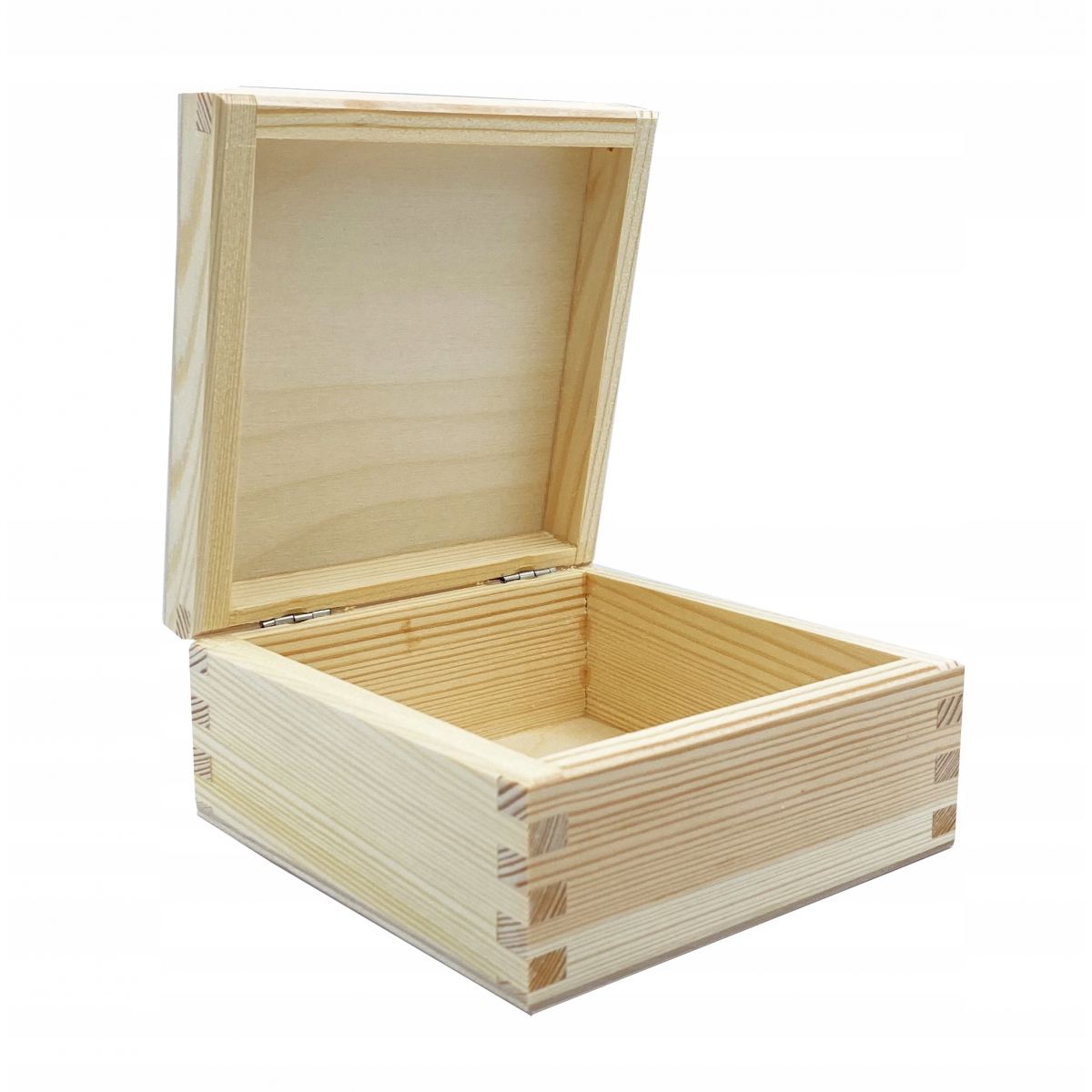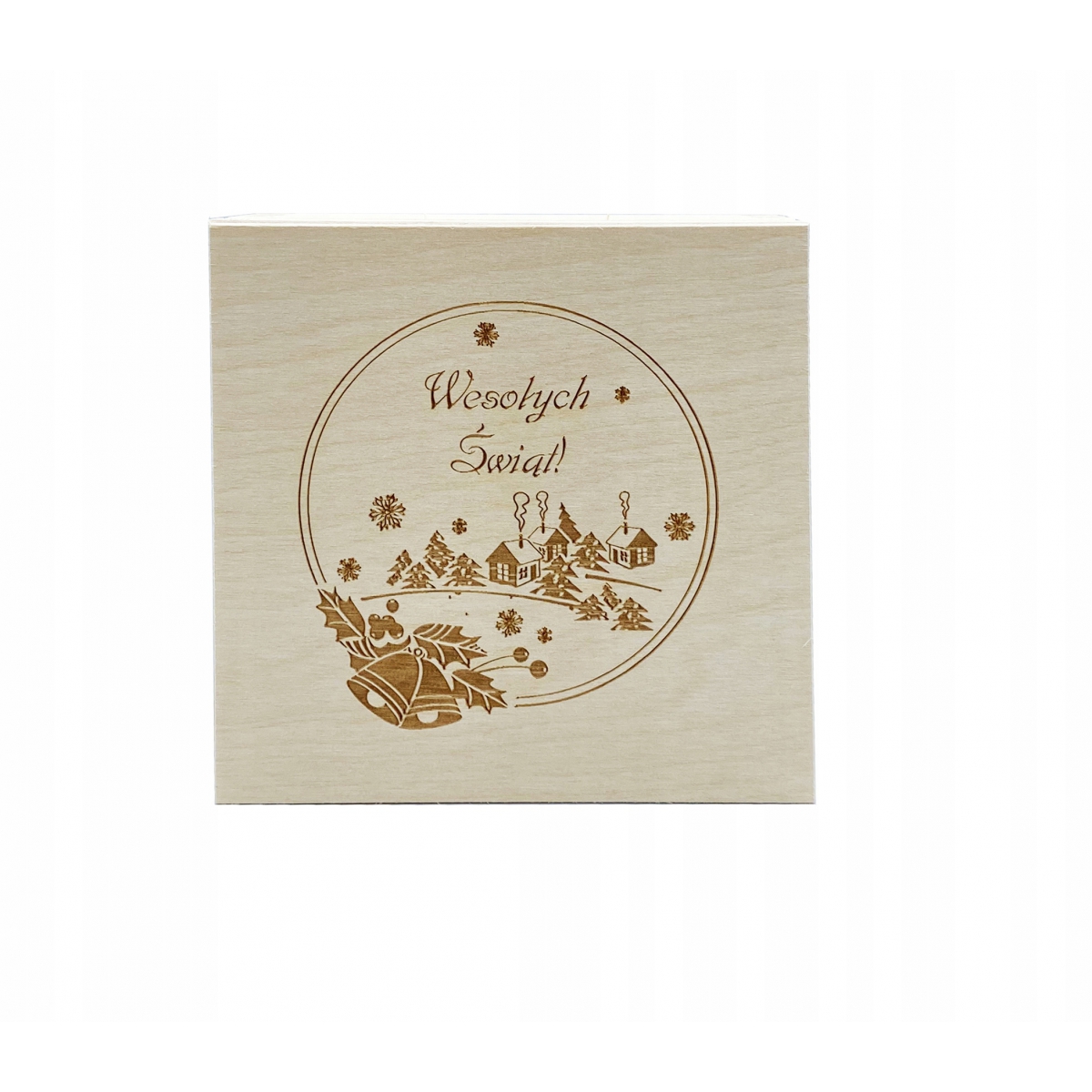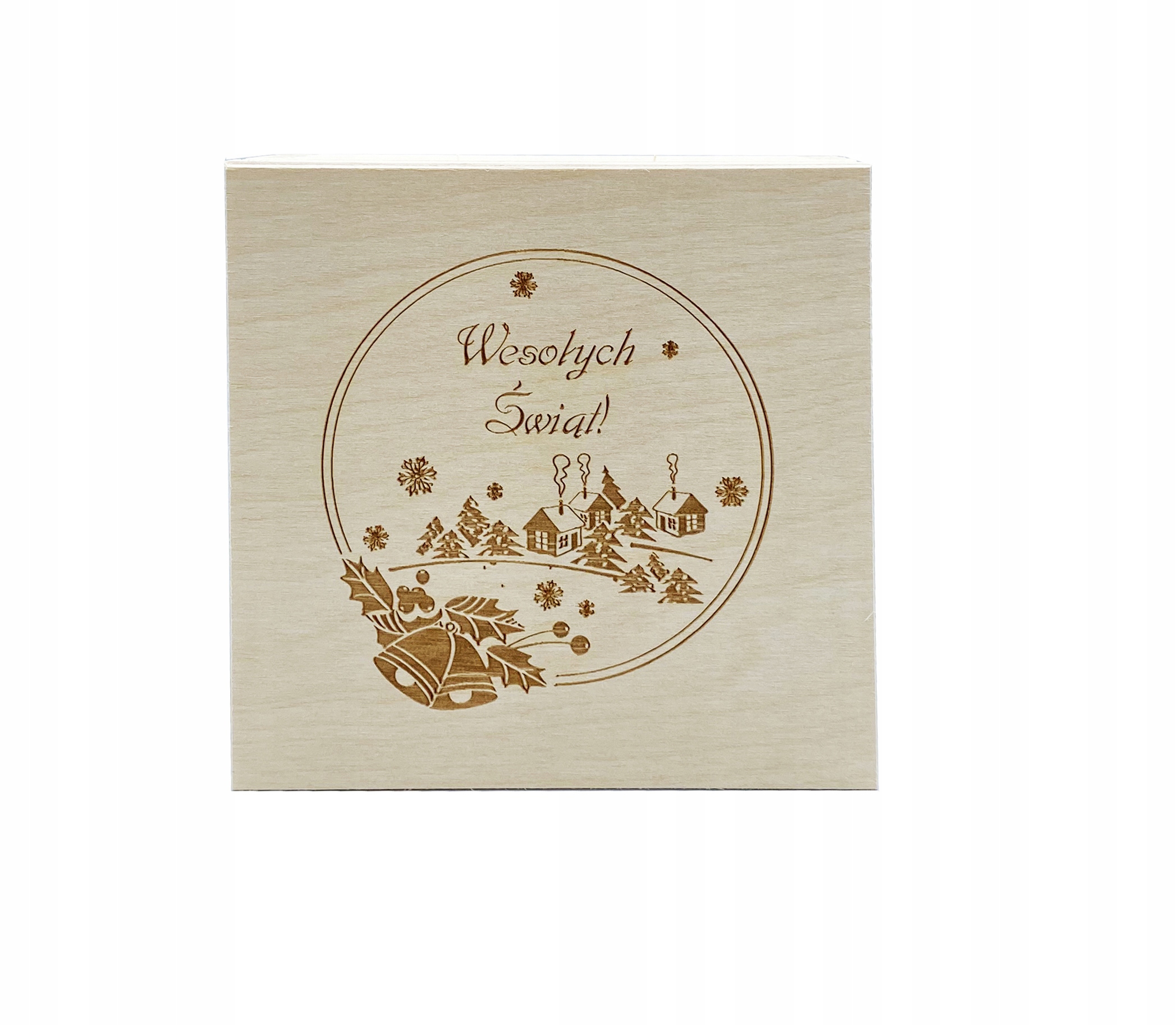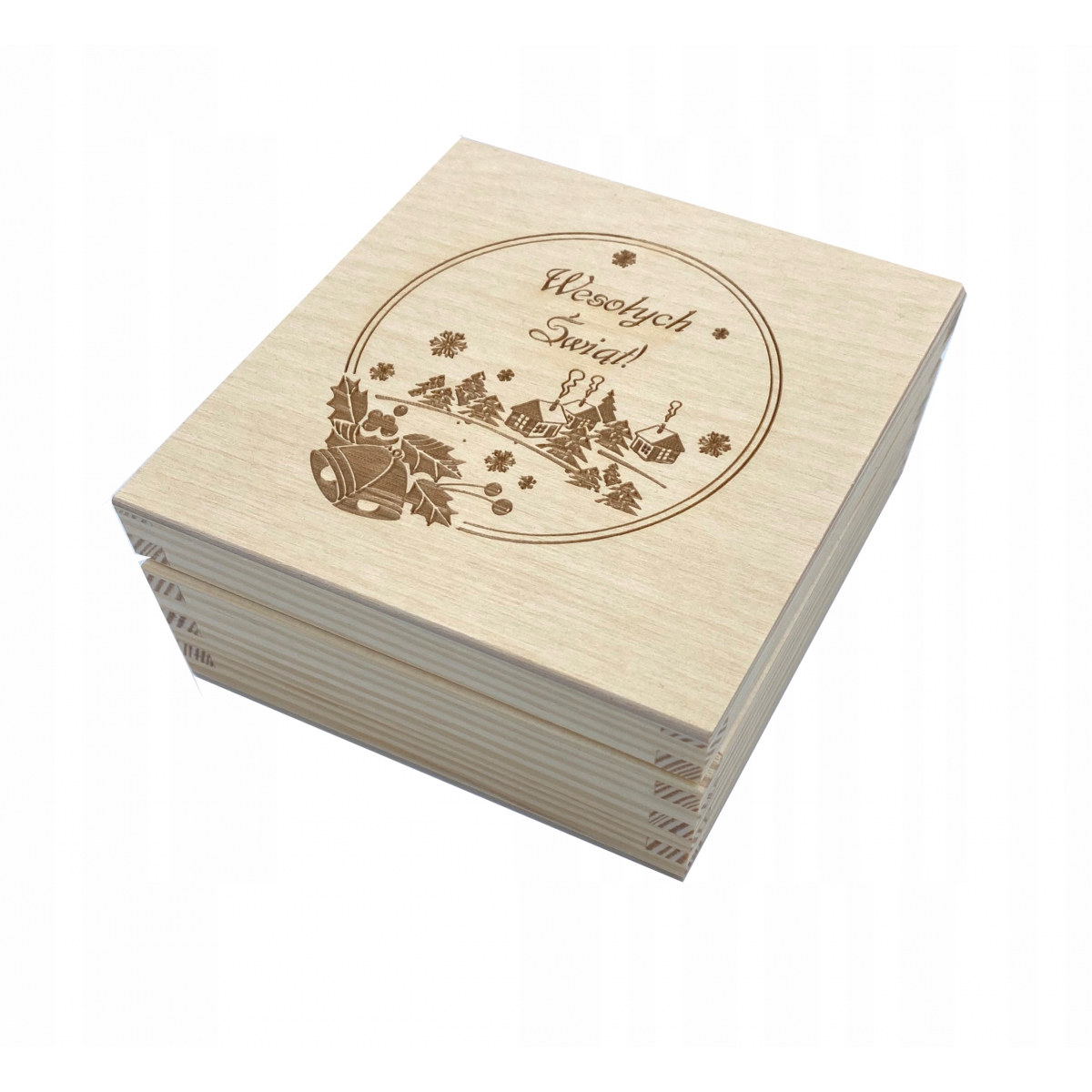 Pudełko drewniane 10x10cm - pudełko otwierane (do góry), wyprodukowane w Polsce. Wieczko posiada grawer z motywem świątecznym. Pudełko wykonane z drewna sosnowego oraz sklejki liściastej.