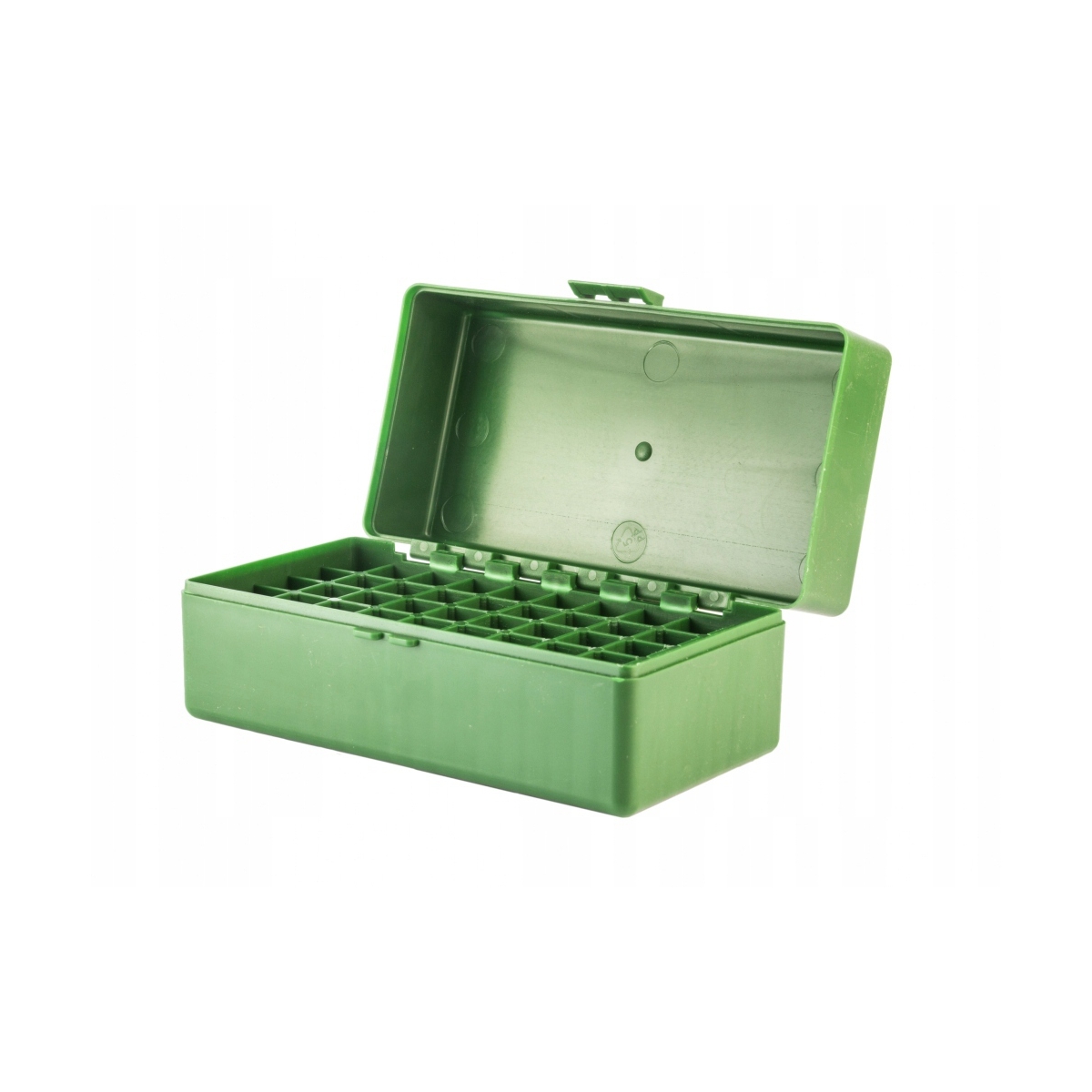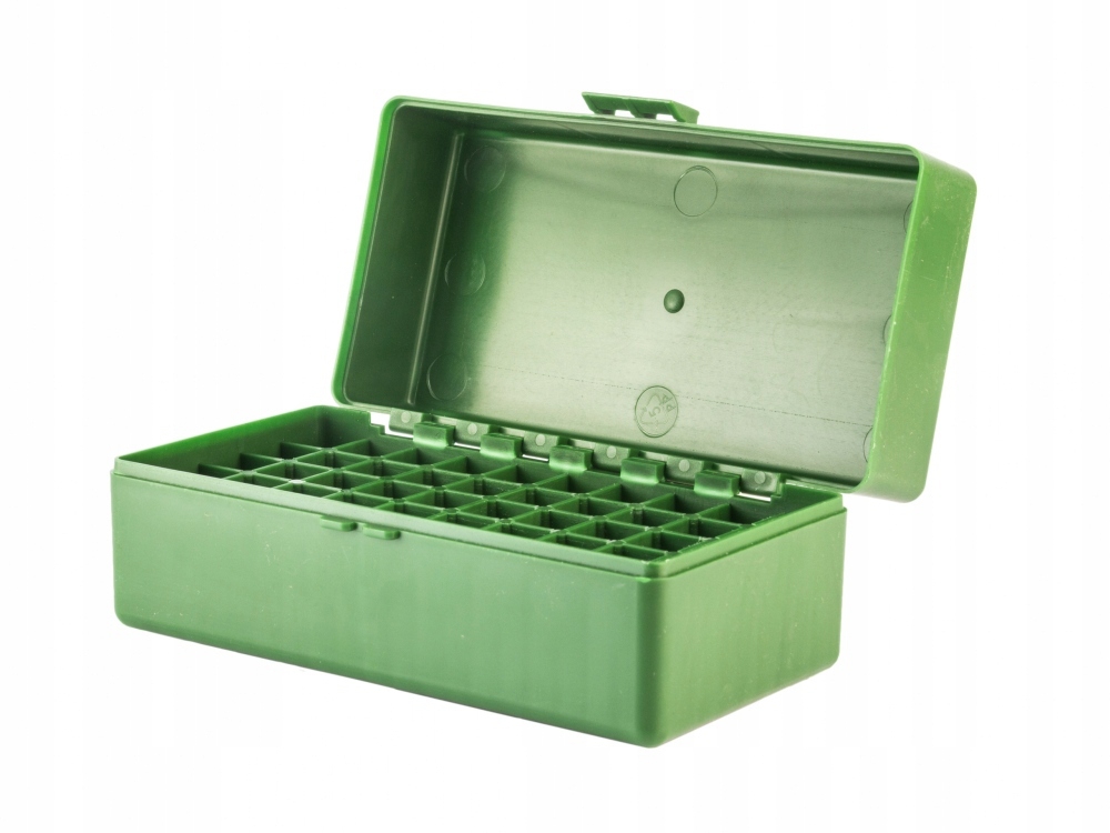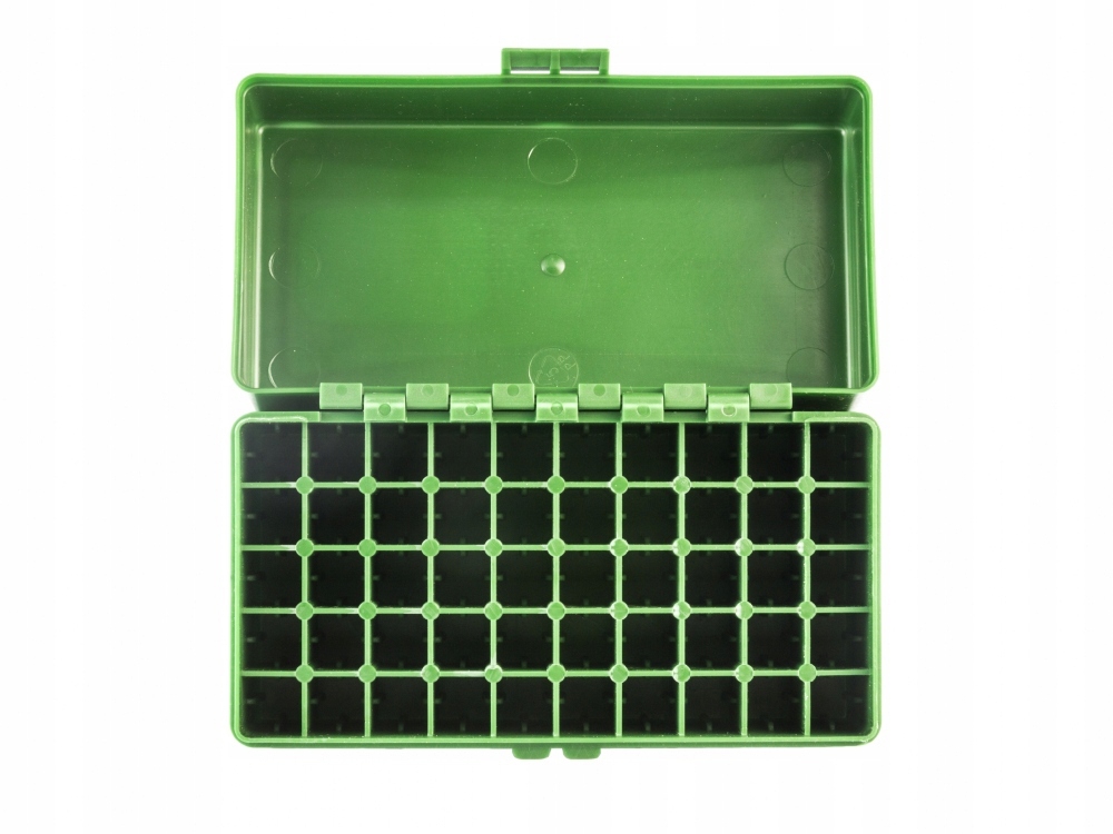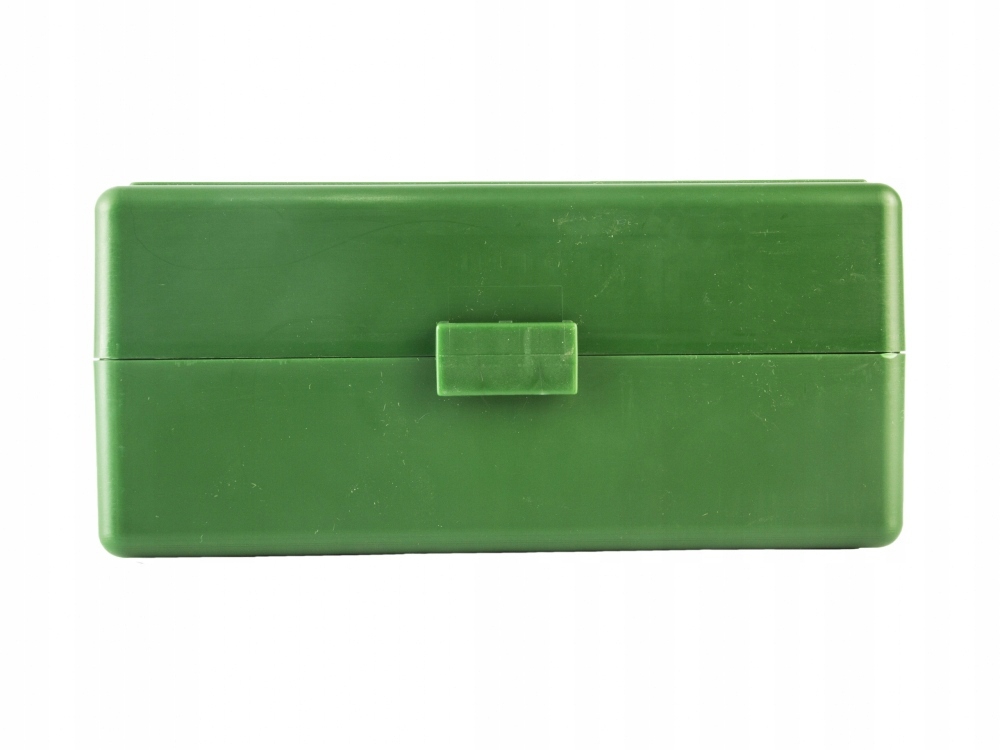 Pudełko na 50 szt naboi pistoletowych kalibru 223rem. Wykonane z twardego tworzywa sztucznego w kolorze zielonym.