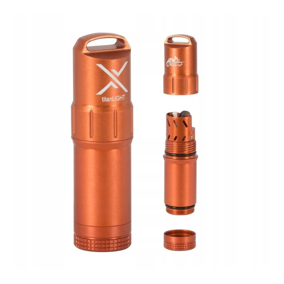 HELIKON TITANLIGHT - to survivalowa zapalniczka benzynowa wyprodukowana dla firmy Helikon przez Exotac. Stanowi niewielkich rozmiarów poręczne źródło ognia, zamknięte w obudowie odpornej na niekorzystne warunki atmosferyczne. Kompaktowa obudowa wykonana została w 100% z aluminium, dzięki czemu zapalniczka wykazuje się dużą odpornością na uszkodzenia mechaniczne oraz niewielką wagą. Gumowe uszczelki nadają konstrukcji wodoodporności i chronią wnętrze nawet po zanurzeniu do głębokości 1 metra, co czyni z niej idealne awaryjne źródło ognia w trakcie kempingu lub trekkingu, nawet w niekorzystnych warunkach atmosferycznych. Możemy ją łatwo przenosić w kieszeni spodni lub plecaku turystycznym.