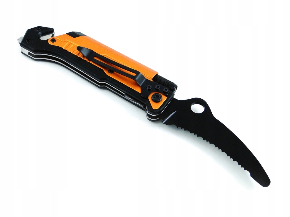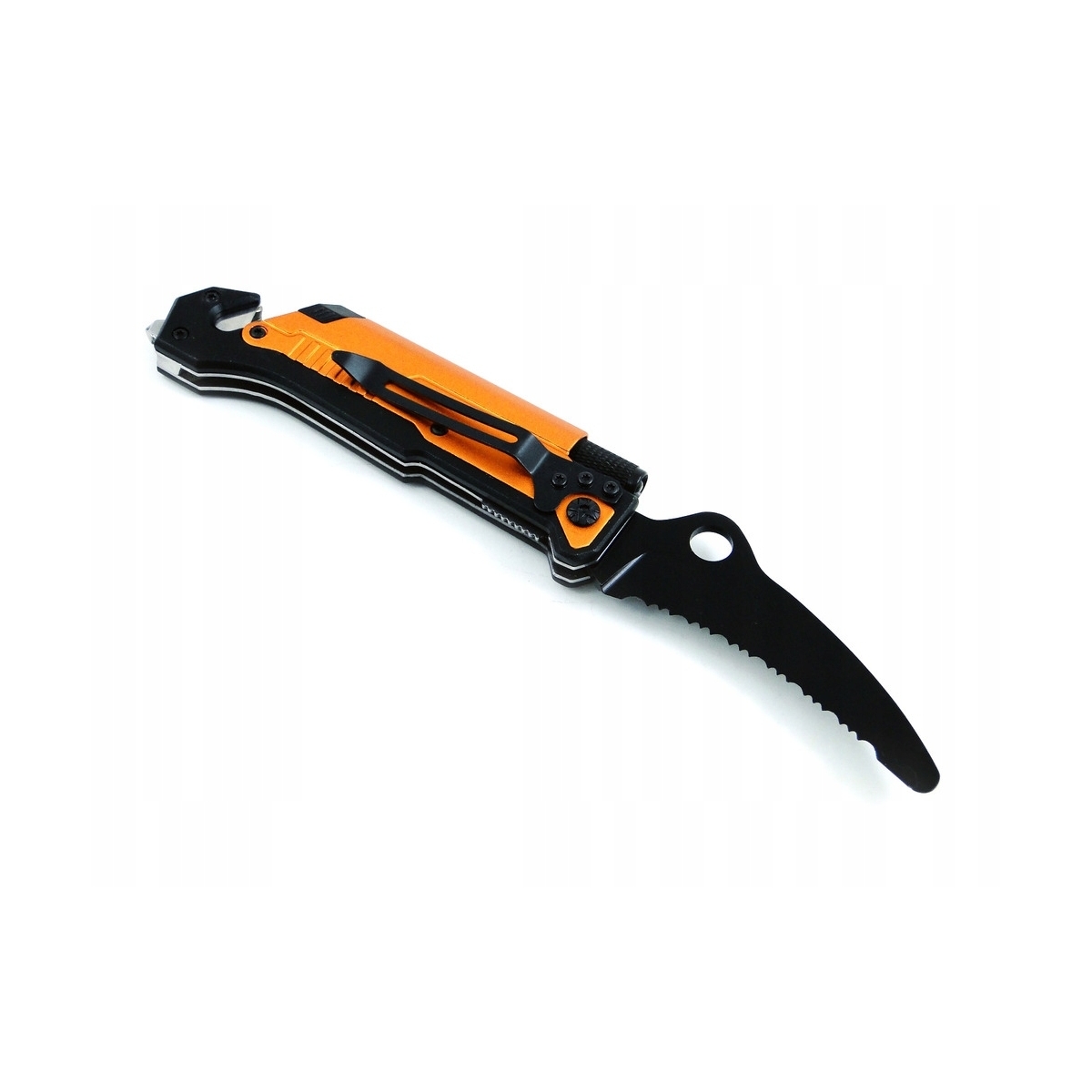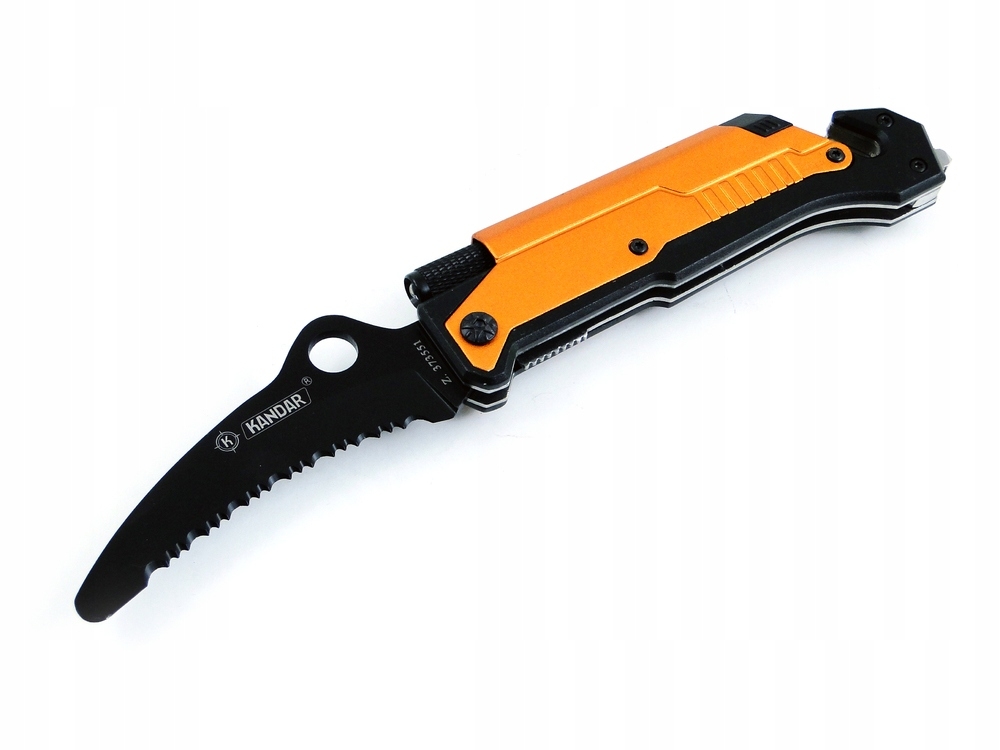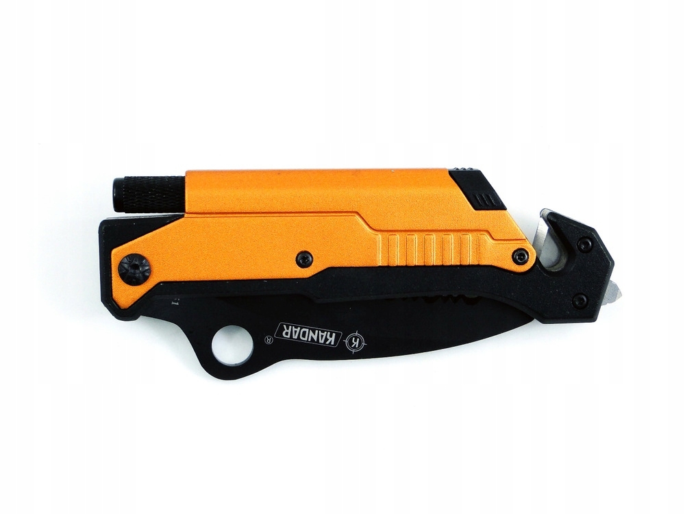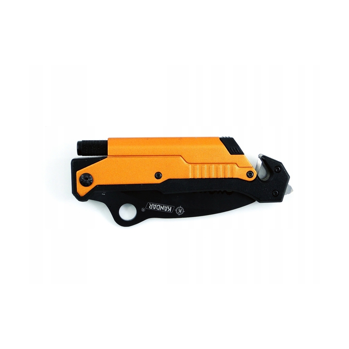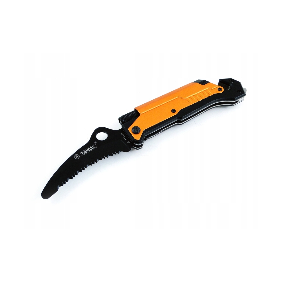 Nóż ratowniczy Kandar typ 5 z latarką i krzesiwem - model składany o surwiwalowo ratowniczym przeznaczeniu. Może służyć zarówno do codziennego użytku jak i alternatywnie w sytuacjach jako nóż ratowniczy. Koniec zakończono zbijakiem do szyb. Dodatkowo posiada ostrze do cięcia twardych linek oraz rozcinania pasów bezpieczeństwa.