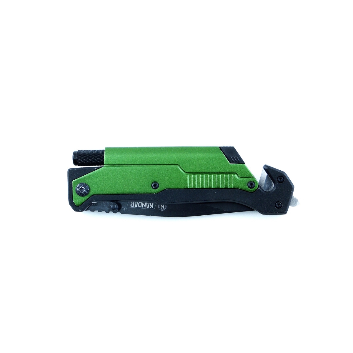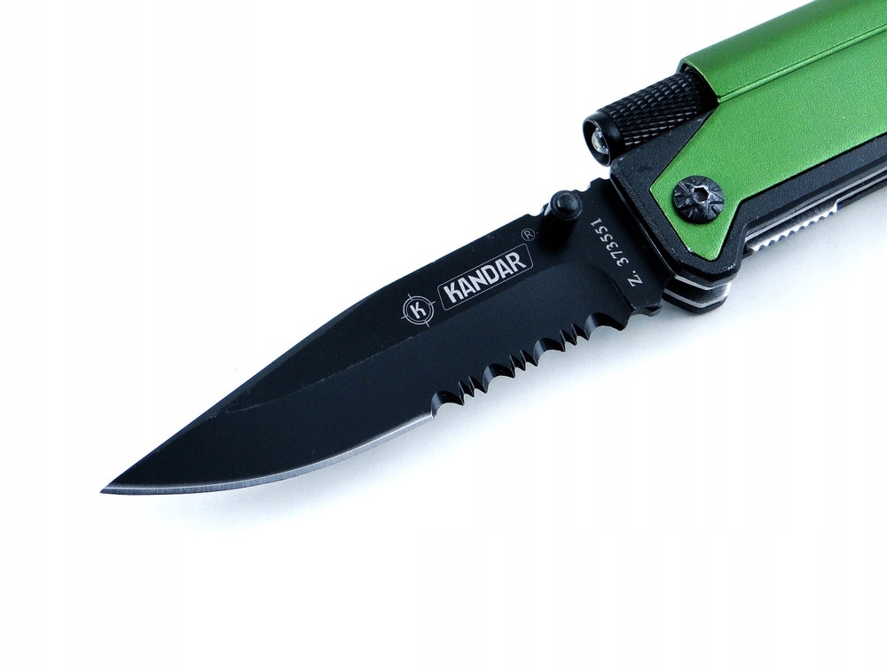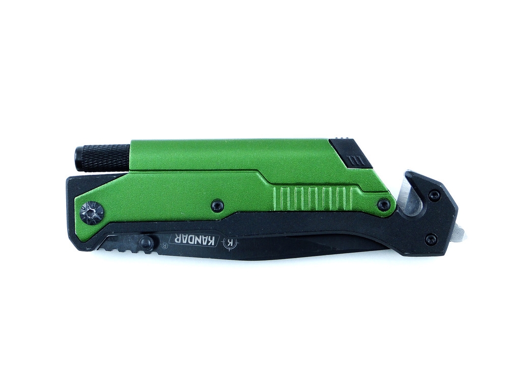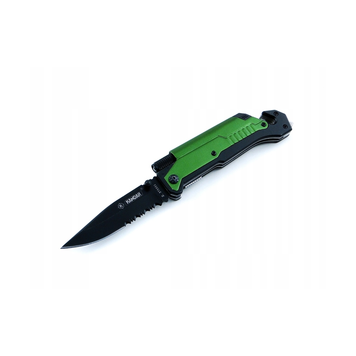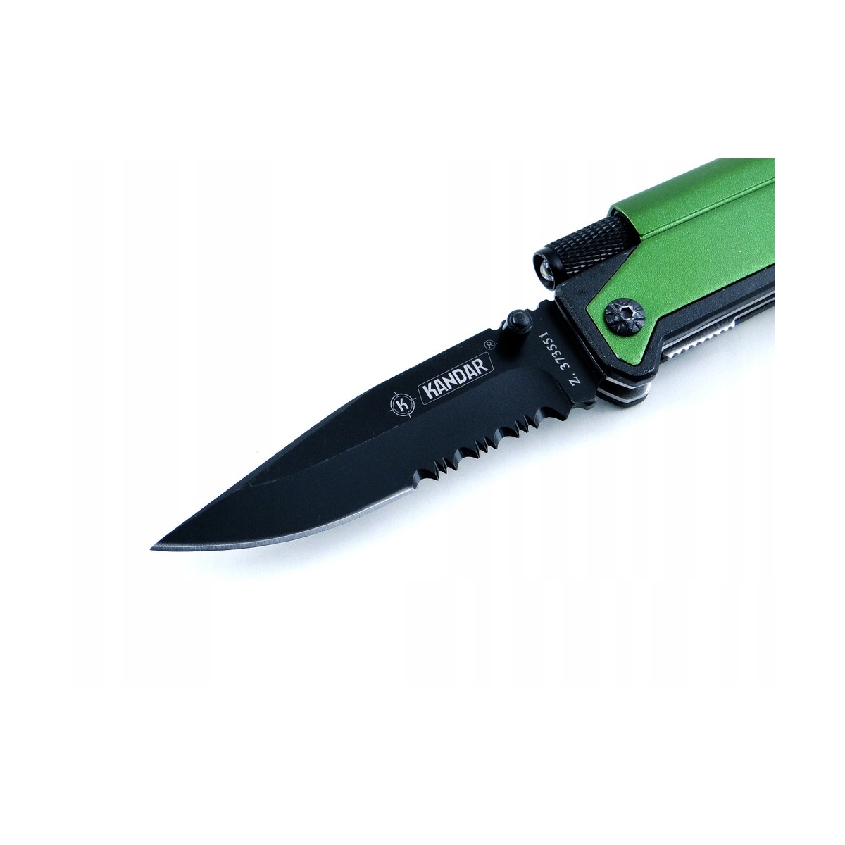 Nóż ratowniczy Kandar typ 12 z latarką i krzesiwem 7.872 - model składany o surwiwalowo ratowniczym przeznaczeniu. Może służyć zarówno do codziennego użytku jak i alternatywnie w sytuacjach jako nóż ratowniczy. Koniec zakończono zbijakiem do szyb. Dodatkowo posiada ostrze do cięcia twardych linek oraz rozcinania pasów bezpieczeństwa.