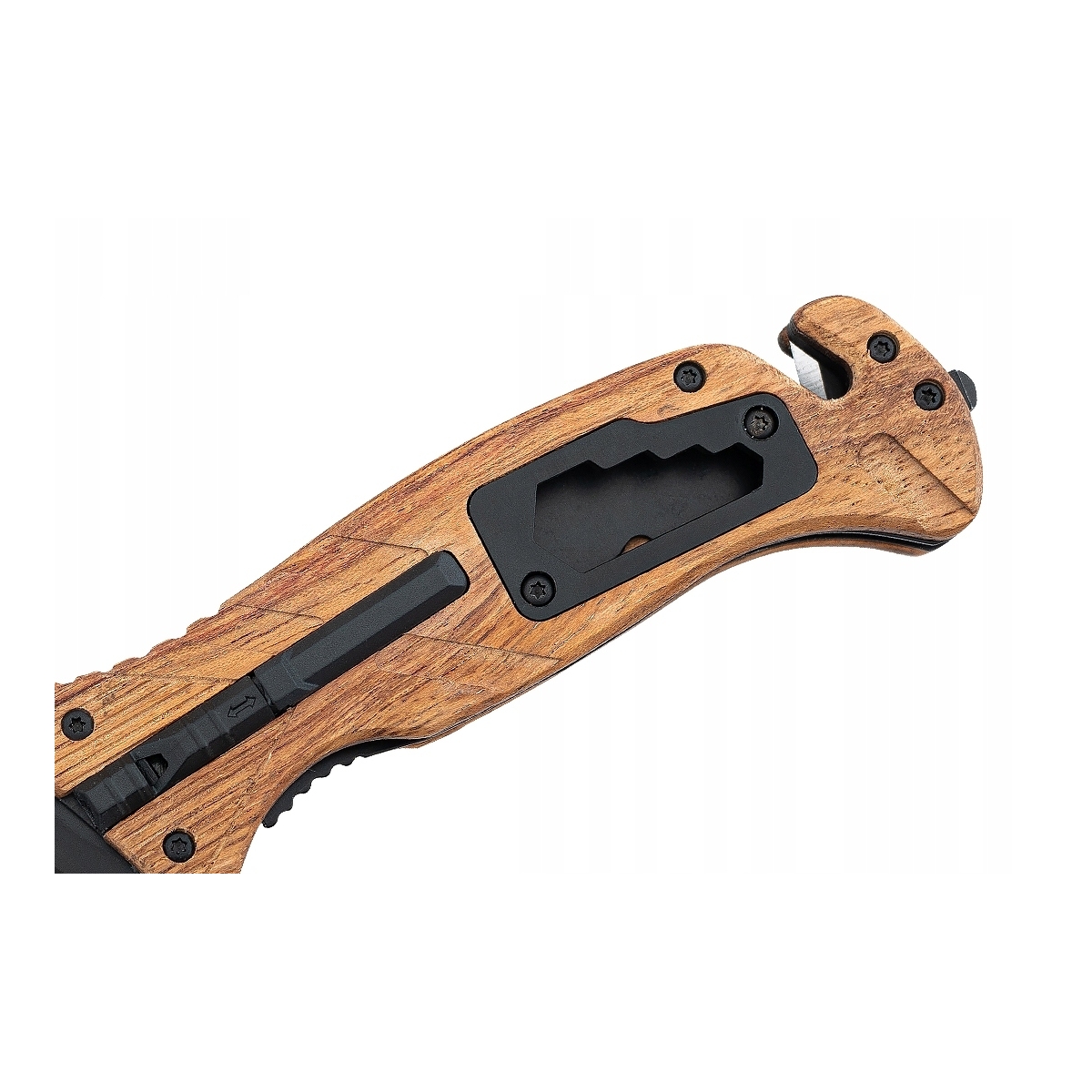 Rękojeść została wykonana z metalu i drewna. Umieszczono na niej krzesiwo z gwizdkiem oraz wycięcie, które pełni funkcję czterech kluczy oczkowych. Z tyłu znajduje się zbijak do szyb oraz bezpieczne ostrze do cięcia pasów/linek. Dodatkowo nóż został wyposażony w klips pozwalający na przymocowanie go do paska.