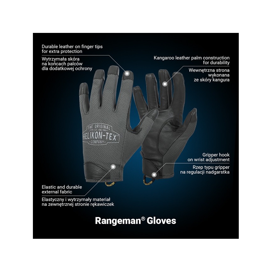 Rękawice HELIKON RANGEMAN - lekkie rękawice przeznaczone do precyzyjnego operowania bronią na strzelnicy. Zaprojektowane przy współpracy z ekspertami w strzelectwie i taktyce, by sprostać nawet najbardziej wymagającym zadaniom. Zastosowane materiały nie krępują ruchów i zapewniają bardzo dobre czucie broni.