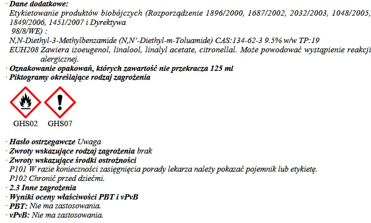 - Zawiera substancję czynną (9,4 %) N,N-dietylo-3-metyolbenzamide-95 g/l (DEET), etanol 357,5 g/l oraz frakcje olejków roślinnych
