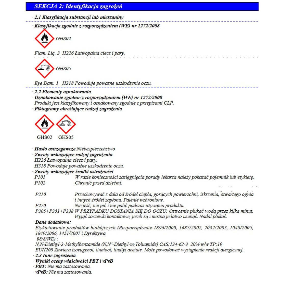 - Substancja czynna: DEET 20%-N,N-Diethyl-meta-toluamide 213 g/L