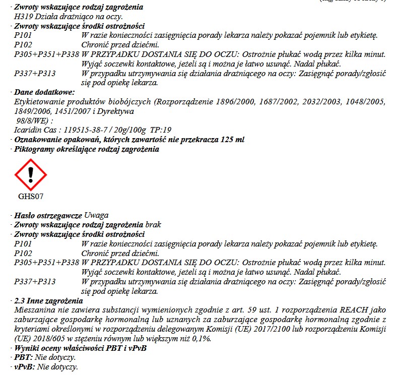 - Skład środka na owady: Ikarydyna 0,5g/100g