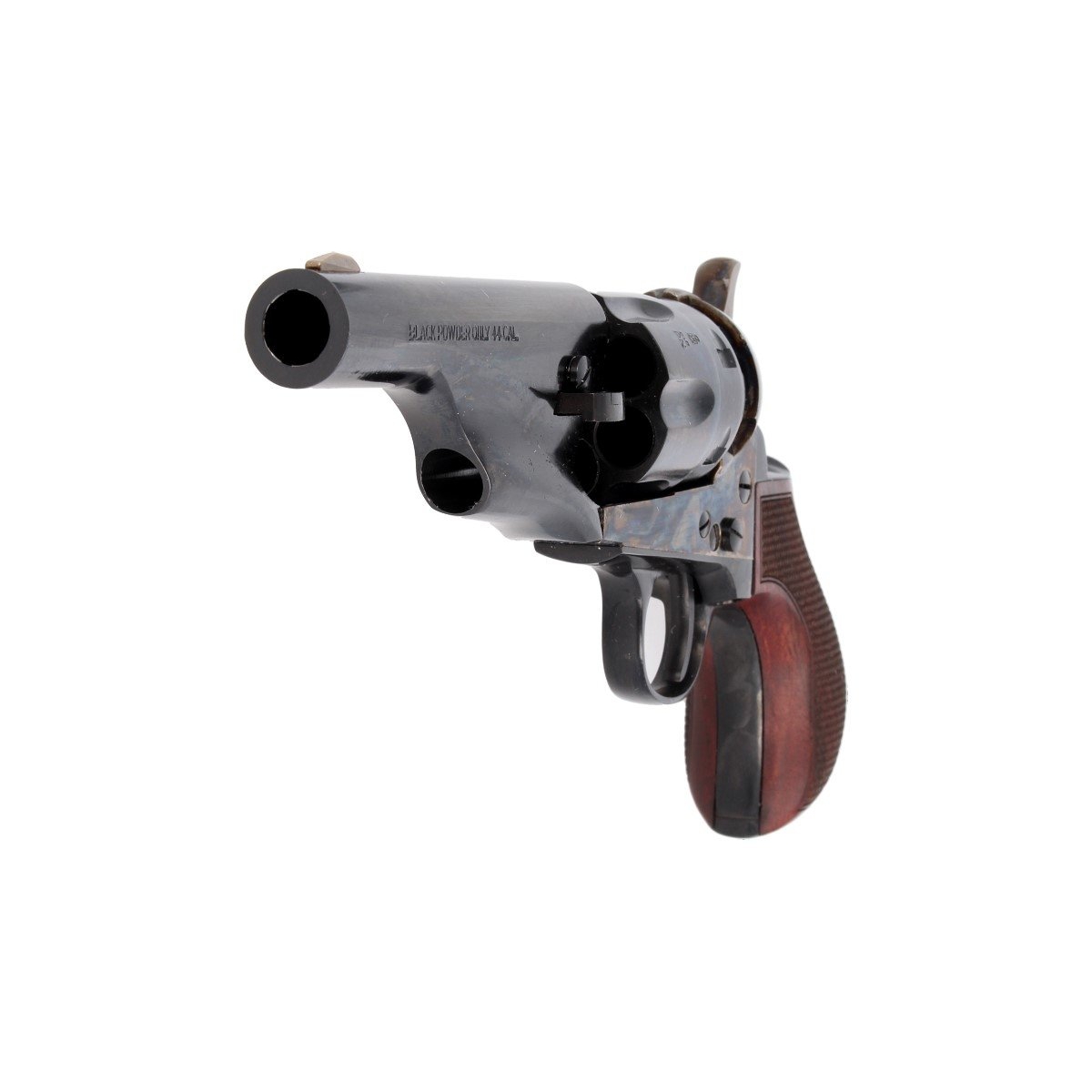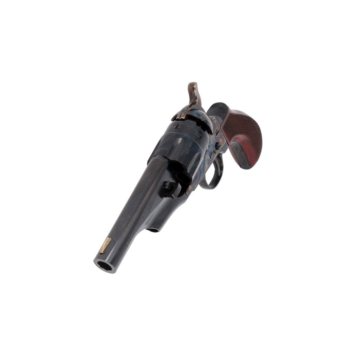 1862 Colt Pocket Army Snubnose .44 z ergonomiczny chwytem Thunderer i przedłużonej 4" lufie. Wersja (LC) z okładzinami o ryflowanej strukturze (Checkered Grip). Najlepszy rewolwer do szybkiego dobycia oraz strzelania na małych dystansach: krótka lufa, poręczna rękojeść Thunderer. Na cylindrze bębna wygrawerowana scena zwycięstwa II Texas Navy w bitwie pod Campeche w roku 1843.