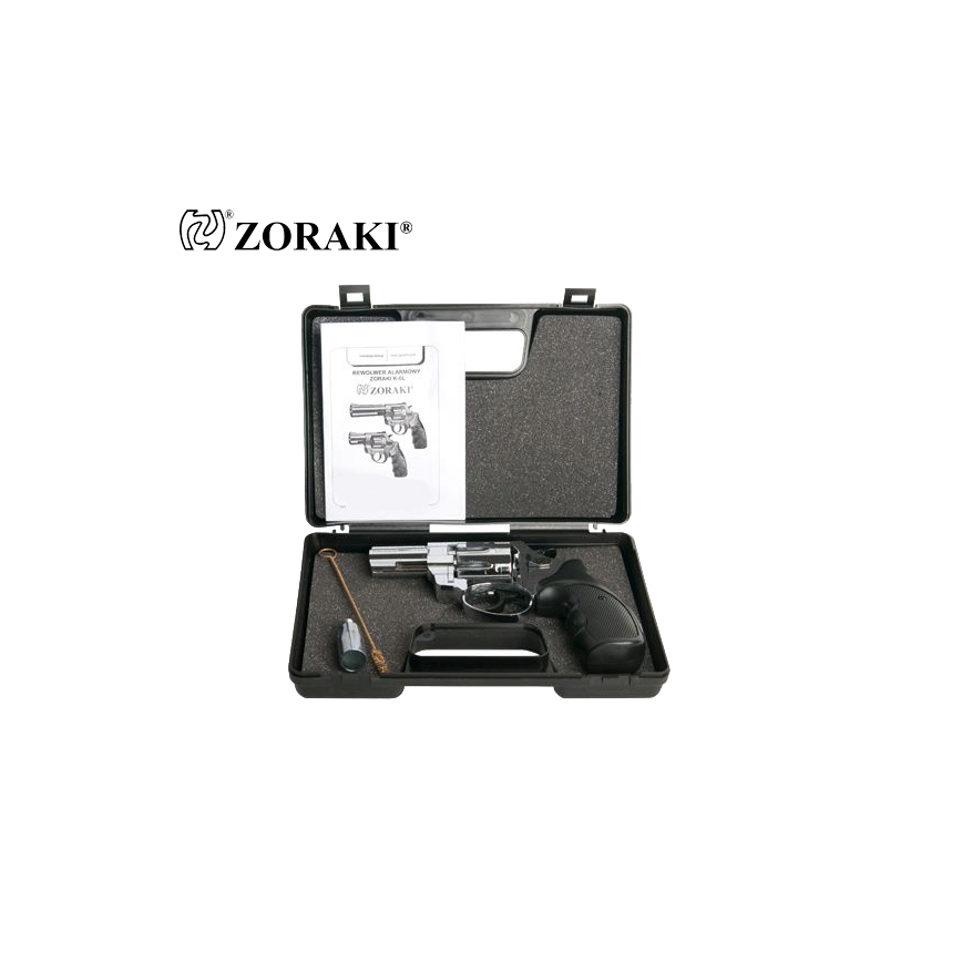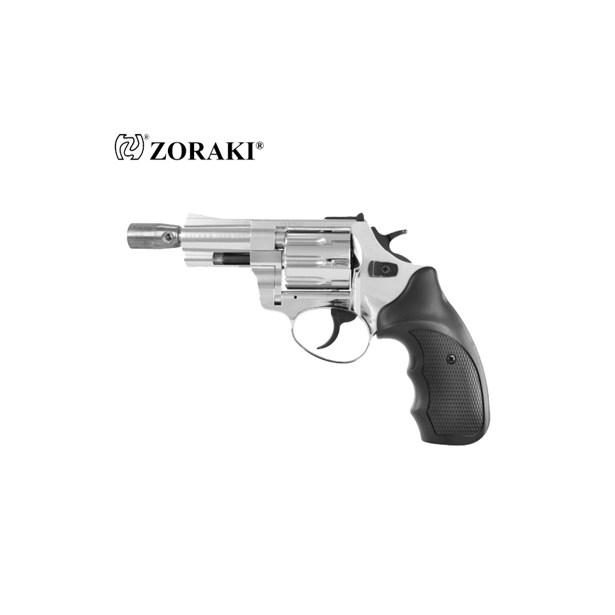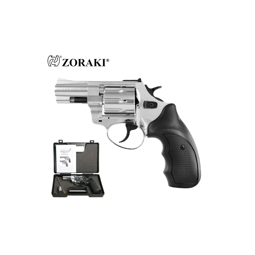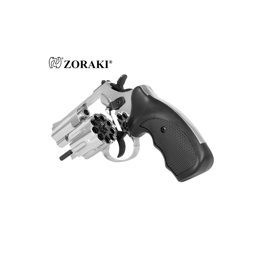 Rewolwer ZORAKI alarmowy hukowy R1-2,5" Chrom to model słynący z niezawodności na amunicję hukową long 6mm. Wykonany został w całości z wysokiej jakości metalu, natomiast okładziny rękojeści z tworzywa sztucznego. Bębenek mieści w sobie 9 sztuk nabojów. Rewolwer oddaje strzały w dwóch trybach: single action oraz double action. Można więc oddawać strzały naciskając od razu spust lub wcześniej odciągając kurek. Do usunięcia łusek służy wyrzutnik łusek (ejector). Rewolwer posiada przyrządy celownicze muszkę i szczerbinkę. W komplecie dołączona została nasadka do rac, co sprawia, że rewolwer może służyć nie tylko jako straszak przeciwko napastnikom czy zwierzętom, ale również może uświetnić wydarzenia okolicznościowe.