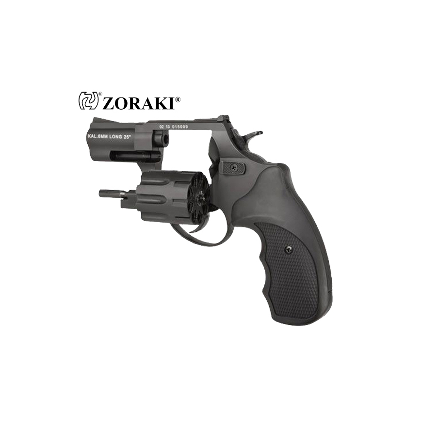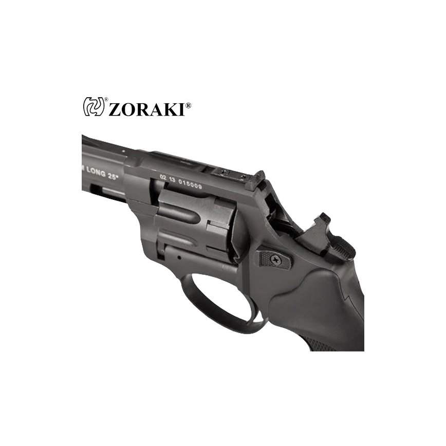 Rewolwer ZORAKI alarmowy hukowy R1-2,5" Czarny to model słynący z niezawodności na amunicję hukową green 6mm. Wykonany został w całości z wysokiej jakości metalu, natomiast okładziny rękojeści z tworzywa sztucznego. Bębenek mieści w sobie 9 sztuk nabojów. Rewolwer oddaje strzały w dwóch trybach: single action oraz double action. Można więc oddawać strzały naciskając od razu spust lub wcześniej odciągając kurek. Do usunięcia łusek służy wyrzutnik łusek (ejector). Rewolwer posiada przyrządy celownicze muszkę i szczerbinkę. W komplecie dołączona została nasadka do rac, co sprawia, że rewolwer może służyć nie tylko jako straszak przeciwko napastnikom czy zwierzętom, ale również może uświetnić wydarzenia okolicznościowe.