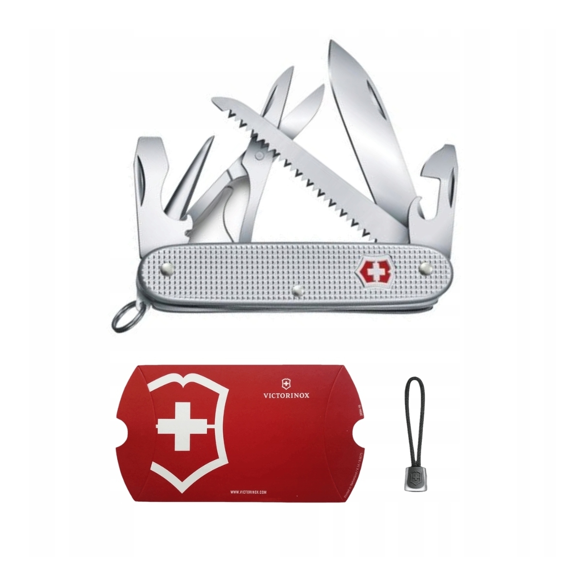 Zestaw zawiera: scyzoryk FARMER ALOX 0.8241.26, troczek VICTORINOX 4.1824 czarny oraz pudełko prezentowe.