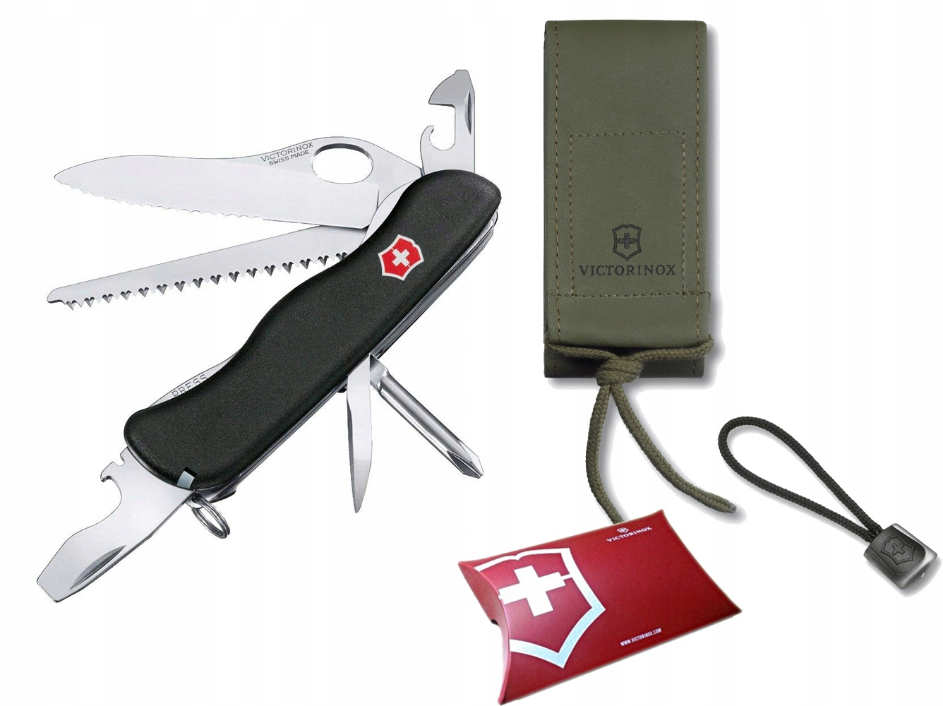 W komplecie etui Victorinox w kolorze oliwkowym. Gratis: zawieszka Victorinox oraz tekturowe pudełeczko Victorinox.