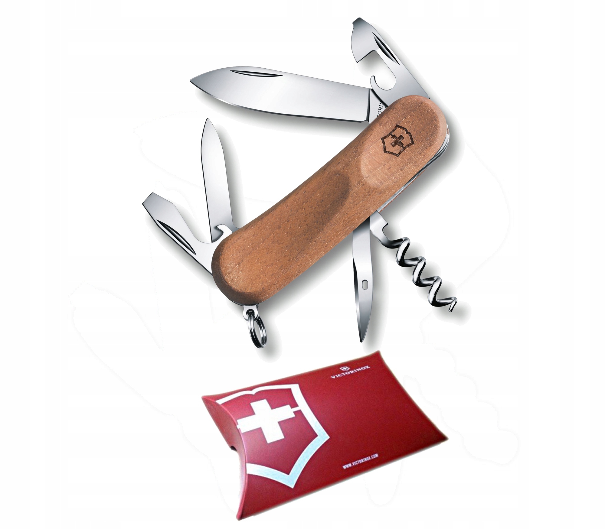 Scyzoryk wyróżnia się swoją drewnianą rękojeścią wykonaną z naturalnego, szwajcarskiego orzecha włoskiego.