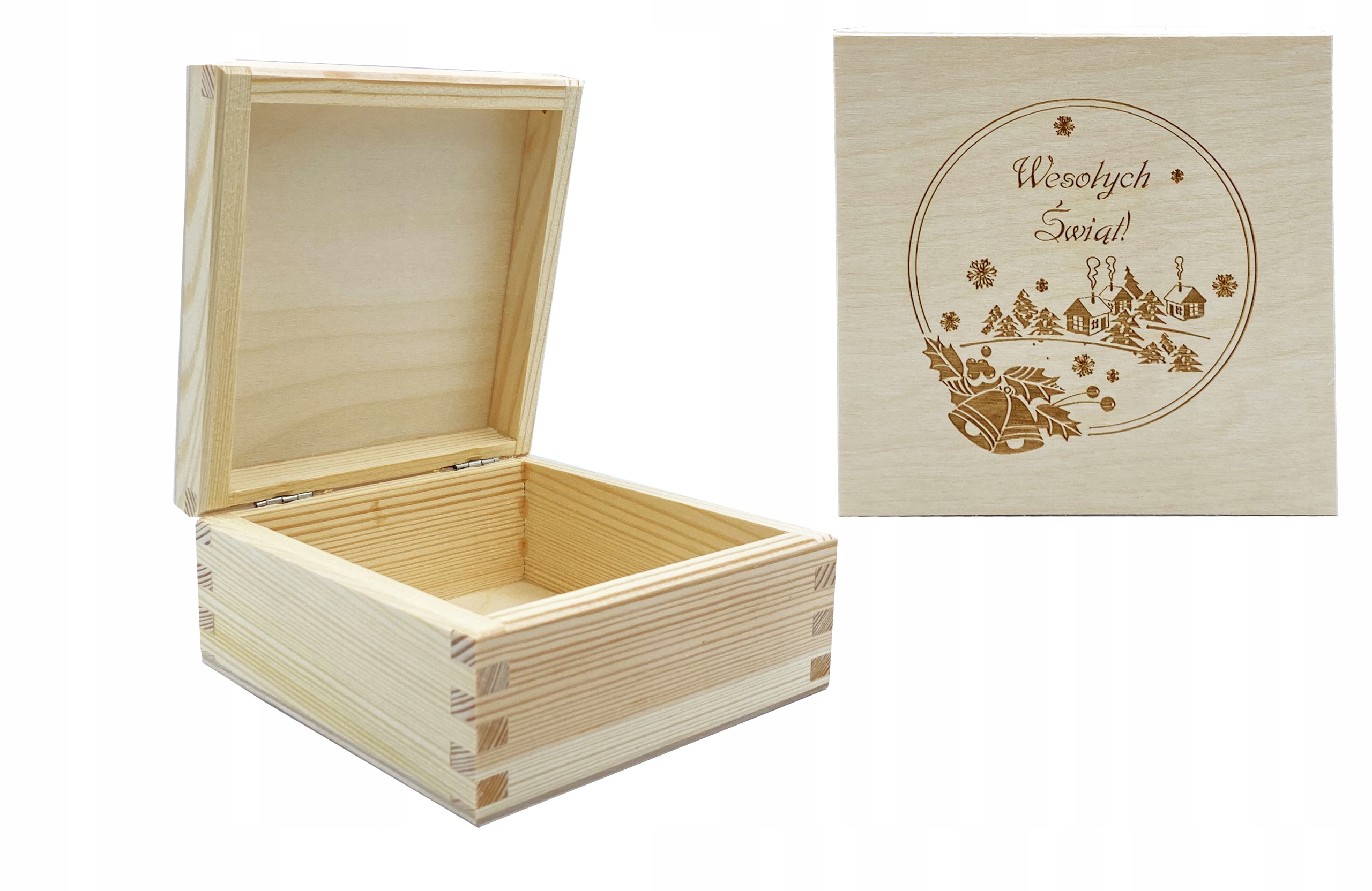 Pudełko drewniane 10x10cm - pudełko otwierane (do góry), wyprodukowane w Polsce. Wieczko posiada grawer z motywem świątecznym. Pudełko wykonane z drewna sosnowego oraz sklejki liściastej.