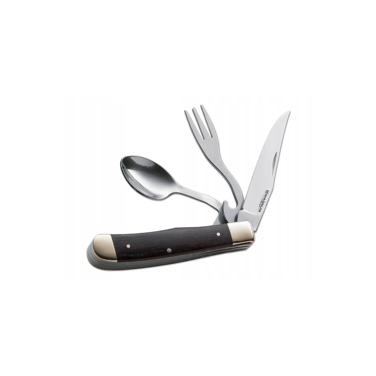 - Nóż, widelec i łyżka wykonane są ze stali 440 i mogą być używane oddzielnie dzięki innowacyjnemu systemowi blokowania.