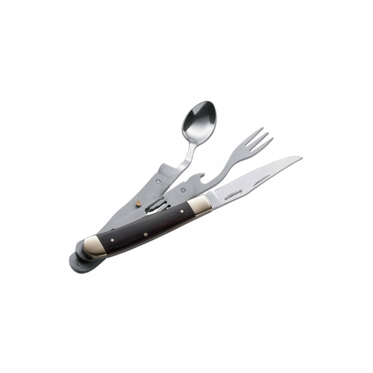 Narzędzie kryje w sobie kilka przydatnych funkcji. Po rozłożeniu jednego z elementów możemy korzystać z łyżki, widelca, noża czy otwieracza do butelek.