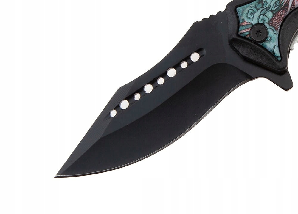- Nóż otwiera się płynnie i instynktownie za pomocą flippera, który po otwarciu pełni rolę jelca chroniącego dłoń przed ewentualnym zsunięciem w stronę ostrza.