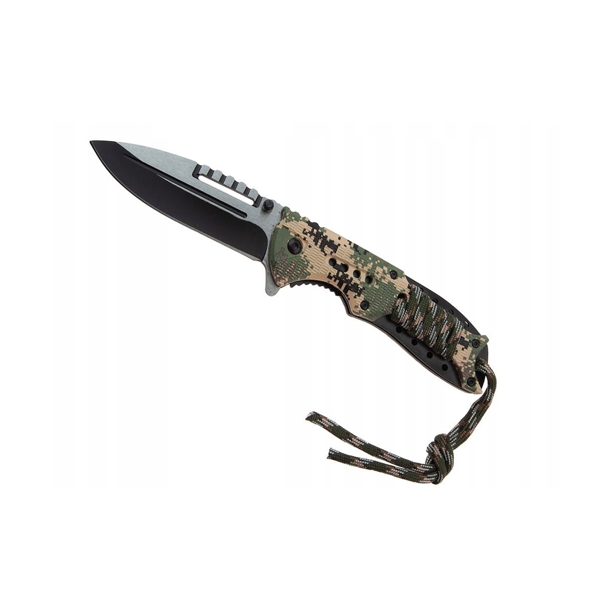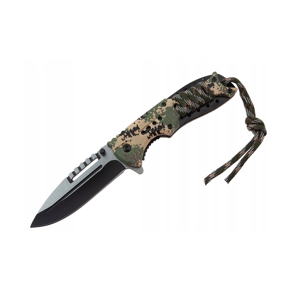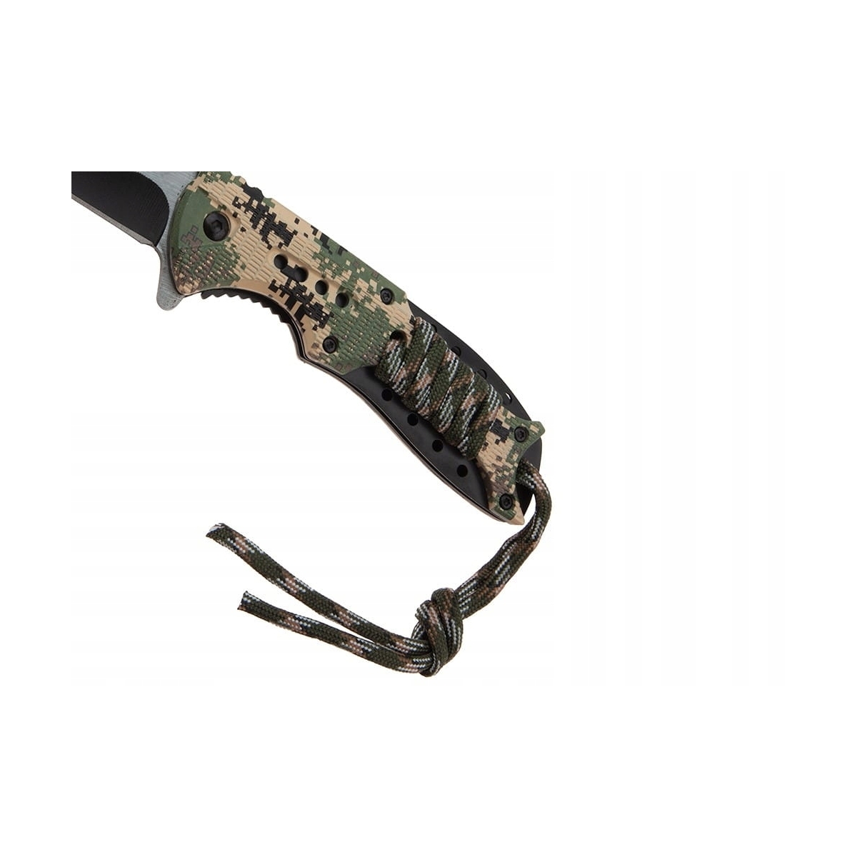 Ergonomiczna rękojeść została wykonana z lekkich okładzin z laminatu G10 oraz oplotu z linki paracord. Nóż doskonale leży w dłoni i zapewnia mocny oraz stabilny chwyt. Rękojeść oraz linka są w kolorze wojskowego kamuflażu.