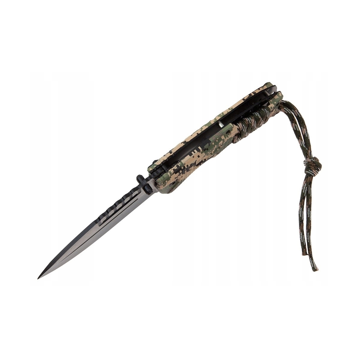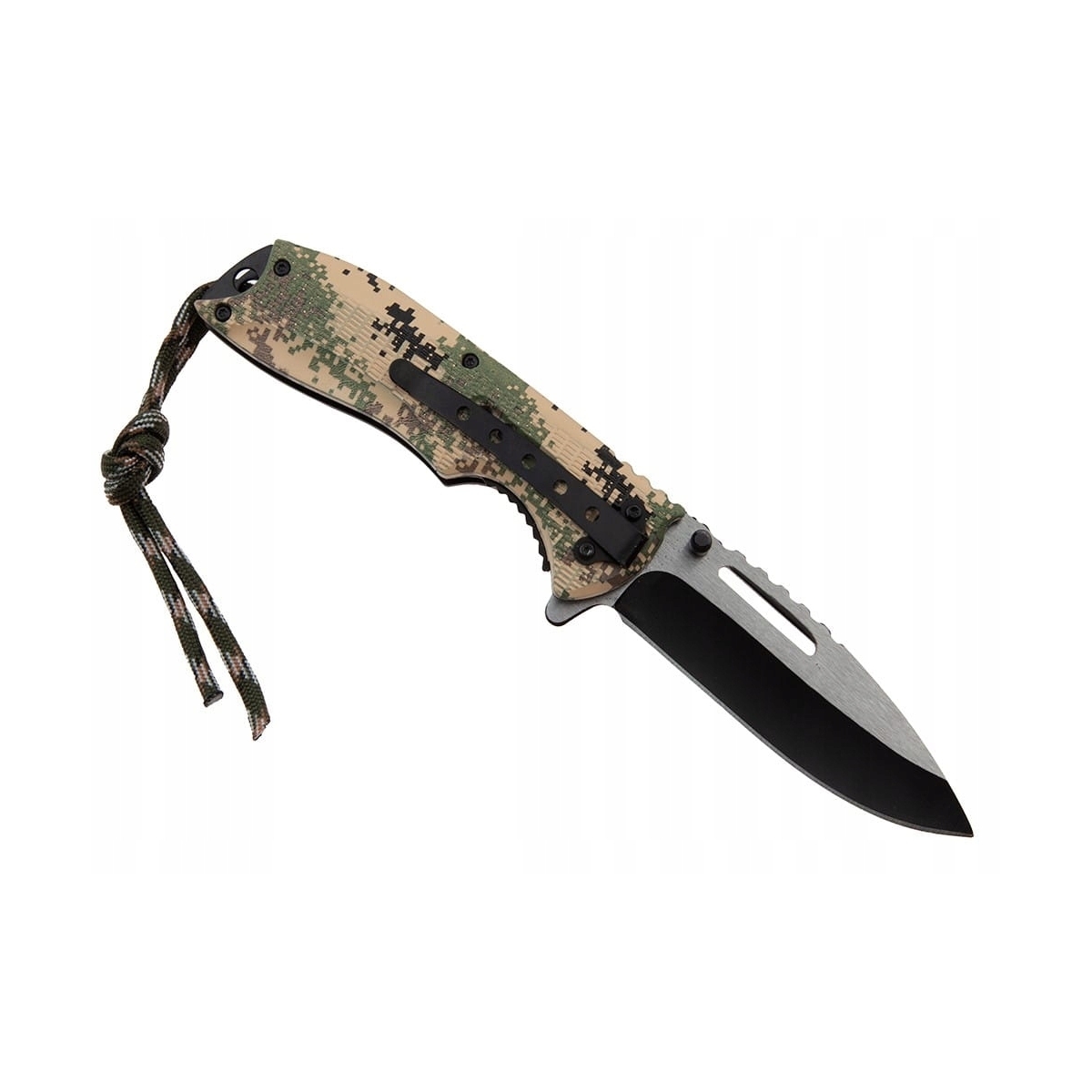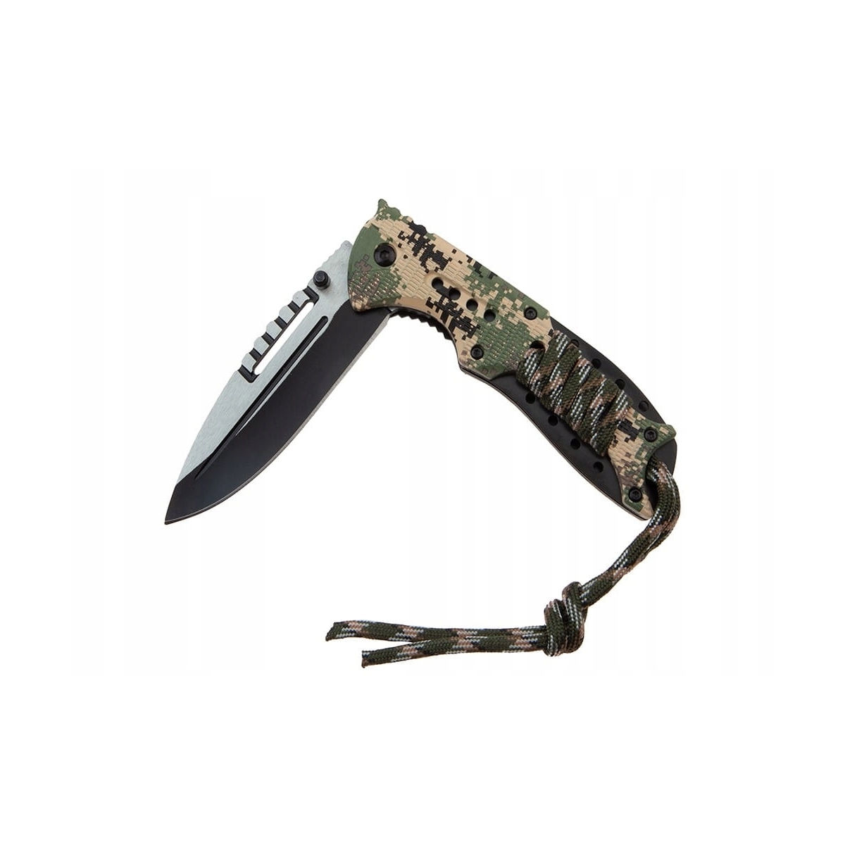 Ergonomiczna rękojeść została wykonana z lekkich okładzin z laminatu G10 oraz oplotu z linki paracord. Nóż doskonale leży w dłoni i zapewnia mocny oraz stabilny chwyt. Rękojeść oraz linka są w kolorze wojskowego kamuflażu.
