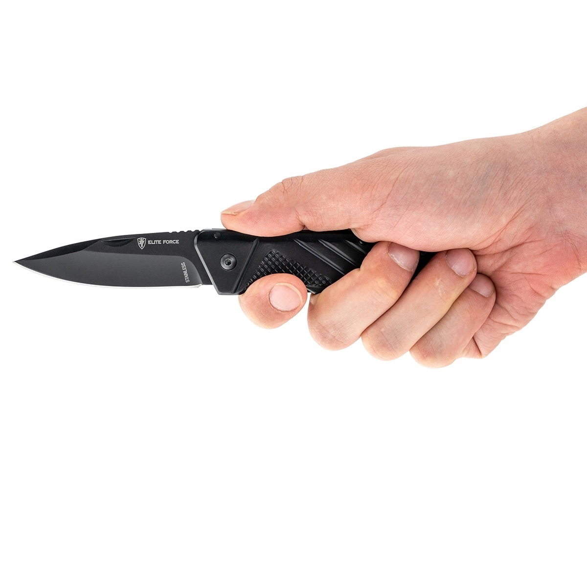 Nóż składany Elite Force EF162 5.0970 - przystosowany do codziennego użytku z głownią 77 mm wykonaną ze stali nierdzewnej. W celu zapewnienia dodatkowej ochrony przed korozją ostrze pokryte zostało czarną powłoką ochronną. Karbowanie na grzbiecie ostrza pozwala na pewne oparcie kciuka podczas pracy z narzędziem. Otwieranie przebiega za pomocą wcięcia na paznokieć.