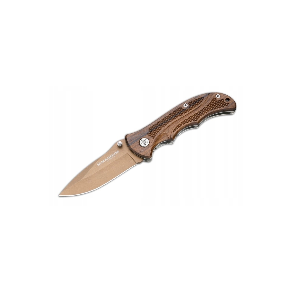 Klinga ze stali 440 pokryta jest brązową powłoką, co idealnie zgrywa się z kolorem rękojeści, z okładkami z drewna.