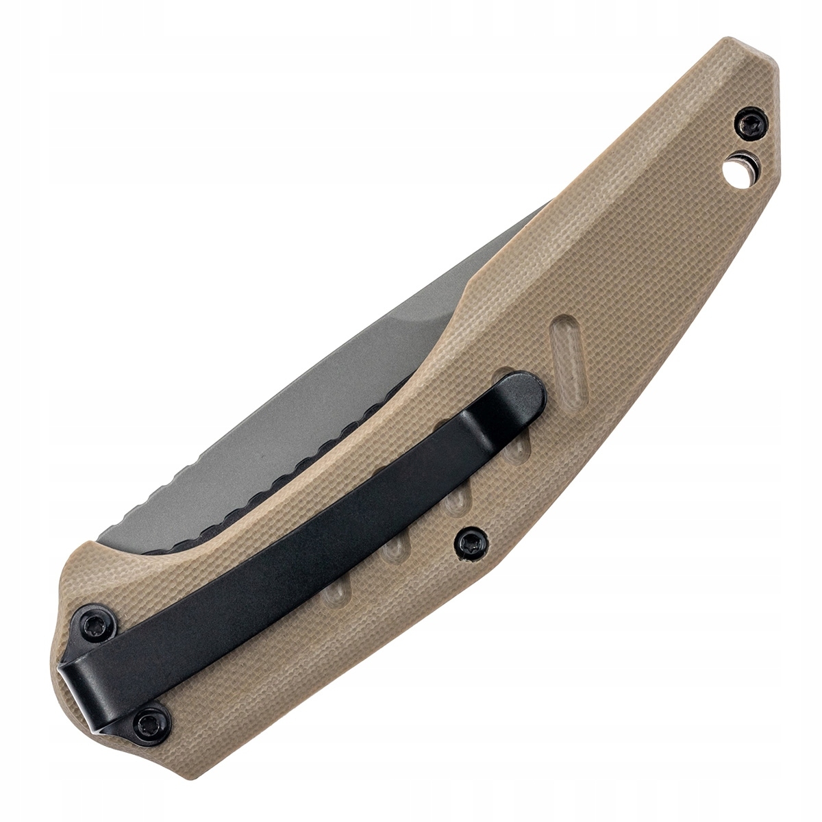 - Rękojeść noża tworzą okładziny z tworzywa G10 w kolorze pustynnym. Jest to laminat szklano-epoksydowy, który cechuje się niskim ciężarem, wysoką wytrzymałością mechaniczną, odpornością na wodę, zmianę temperatur, a także działanie wielu kwasów i rozpuszczalników.