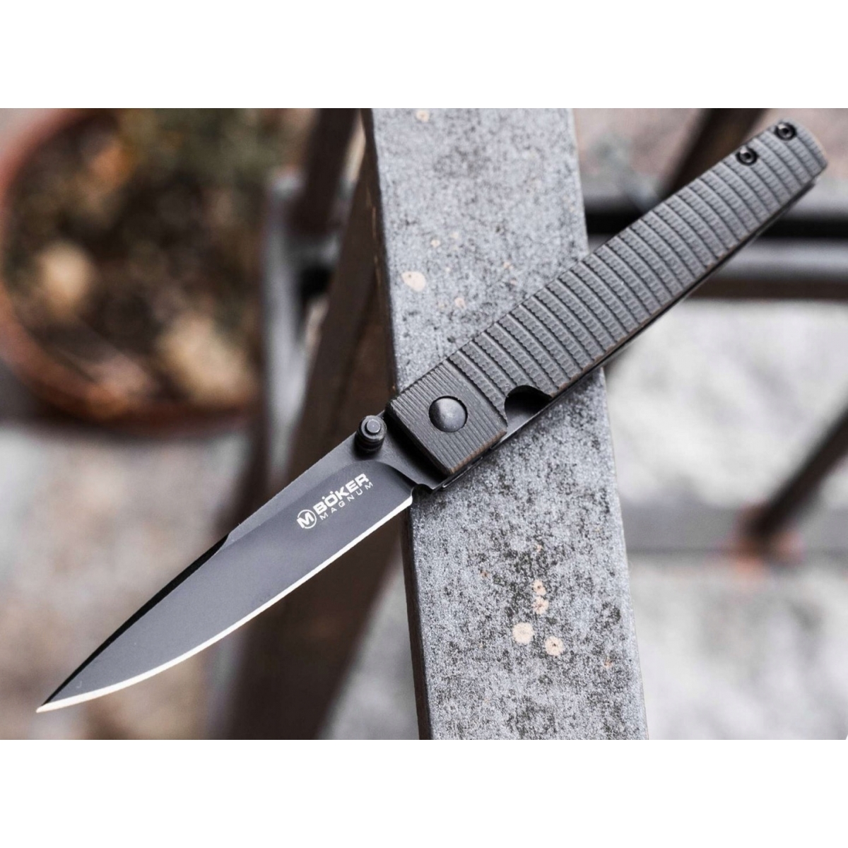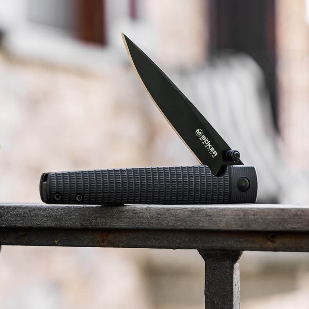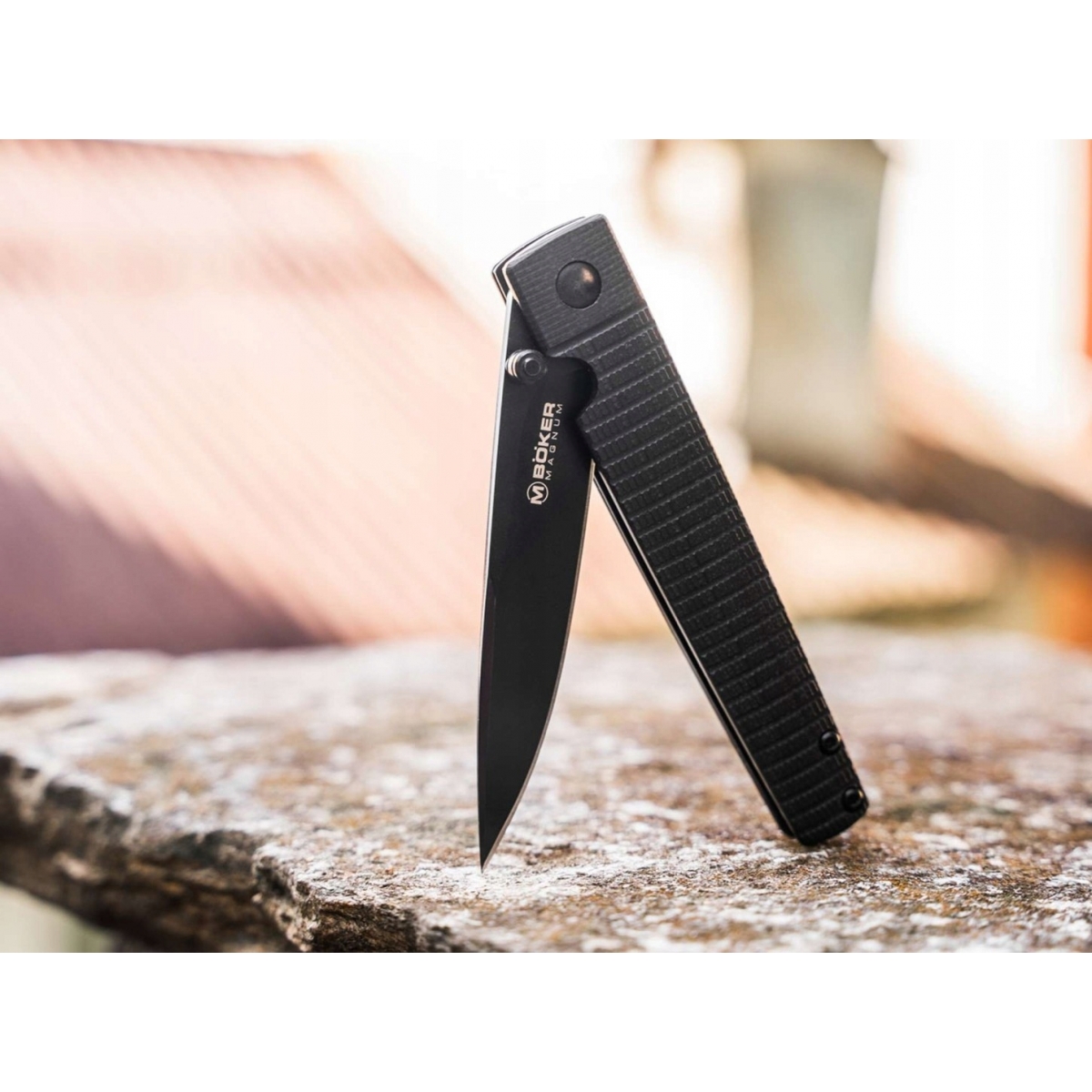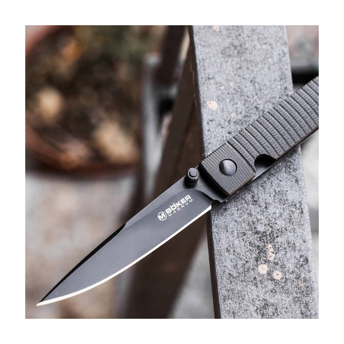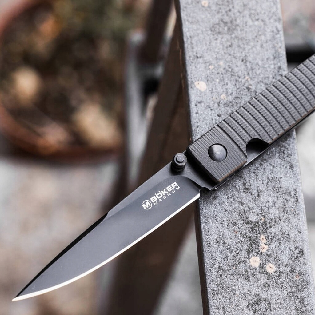 BOKER MAGNUM STEREO (01RY004)- to składany nóż do codziennego użytku (EDC). Został zaprojektowany głównie z myślą o odporności na uszkodzenia mechaniczne oraz łatwości ostrzenia. Biorąc pod uwagę te cechy, głownię o profilu Drop-Point wykonano ze stali nierdzewnej 440A. Materiał ten długo utrzymuje ostrość, jest odporny na korozję i wytrzymały na naprężenia mechaniczne. Ostrze pokryte zostało czarną powłoką ochronną zapewniającą dodatkowe zabezpieczenie przed korozją.