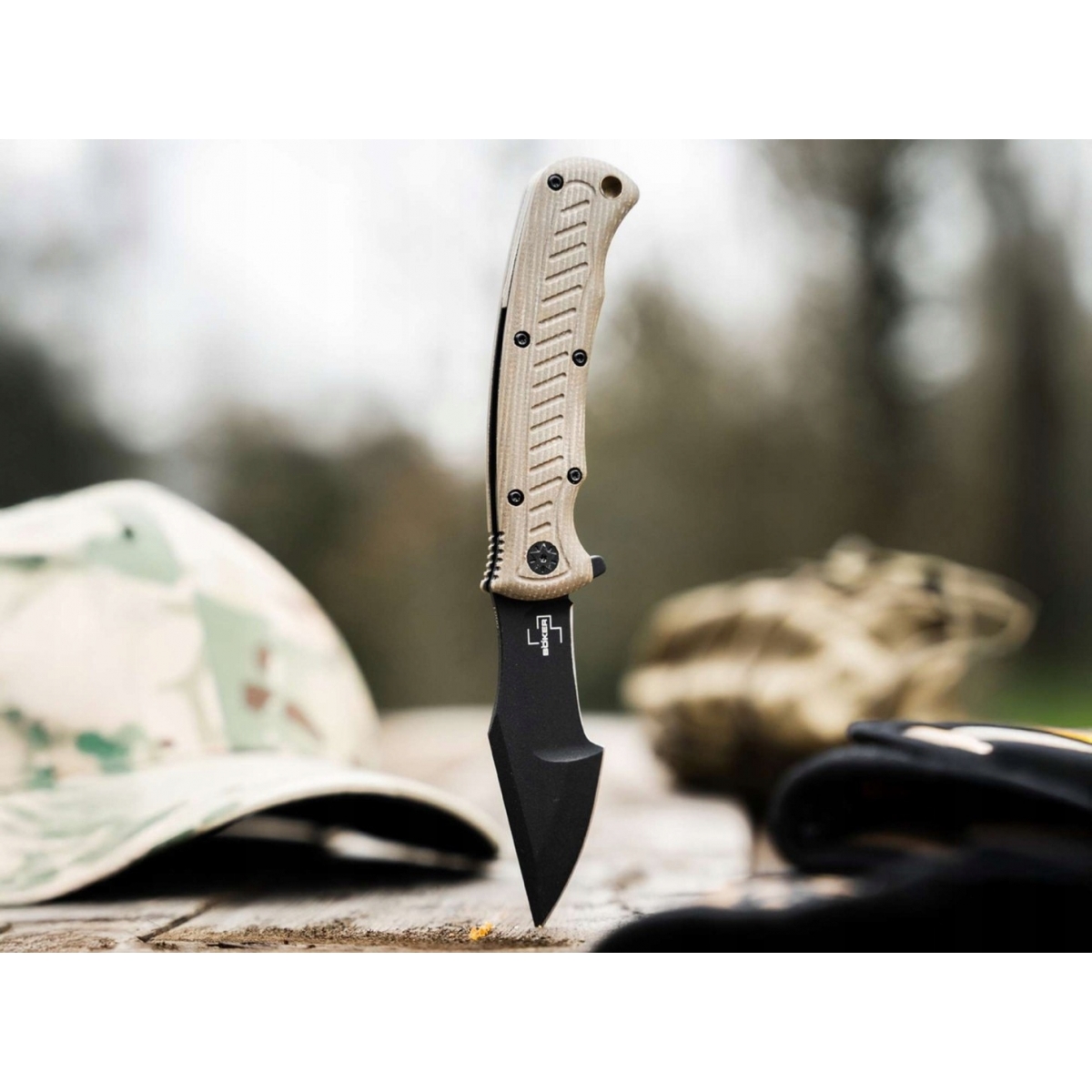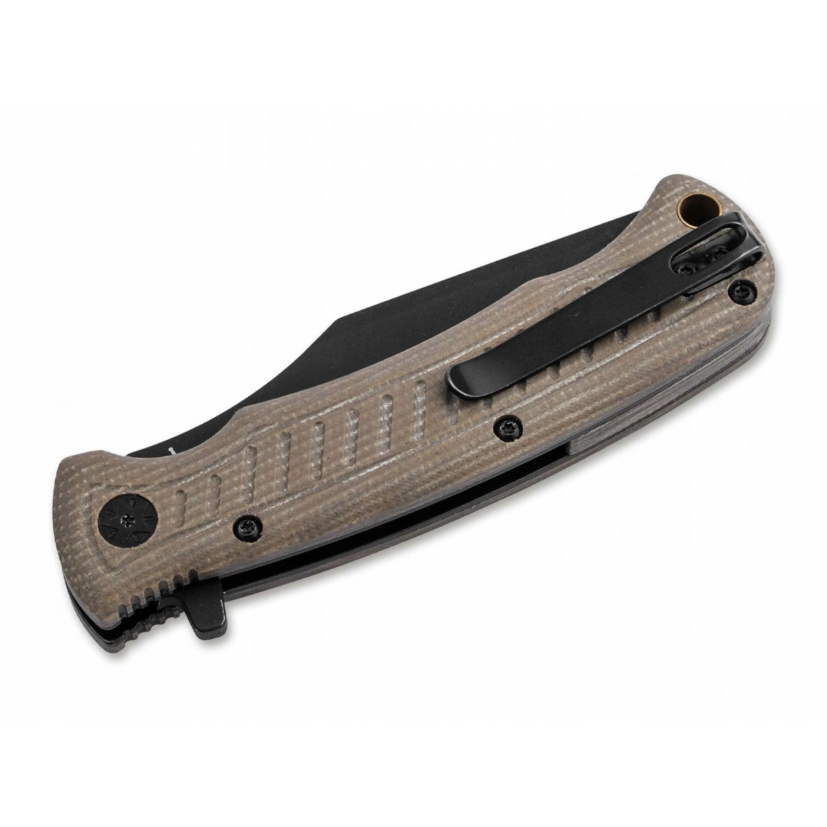 Ergonomiczne okładziny rękojeści wykonane z brązowego Micarta oraz wydrążony mosiężny kołek na końcu rękojeści do mocowania smyczy przypominają modele stałe z popularnej serii Boker Plus Tracker. Dostarczany z głęboko osadzonym klipsem (tip-up/r) oraz wysokiej jakości nylonową pochewką.