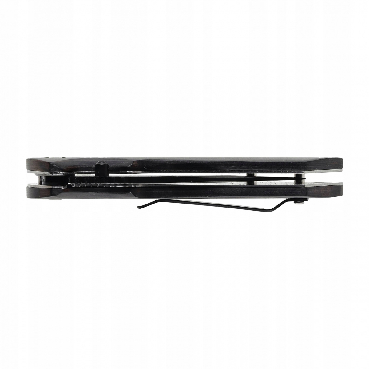 W nożu użyto okładzin z drewna palisandrowego. Są one często używane w nożach ze względu na wyjątkową twardość i trwałość. Charakteryzują się bogatą, ciemną barwą i wyraźnymi, wyeksponowanymi słojami, nadając tym samym nożowi ekskluzywny wygląd. Jest to materiał odporny na czynniki atmosferyczne i intensywne zużycie, co zapewnia długotrwałe piękno i funkcjonalność.