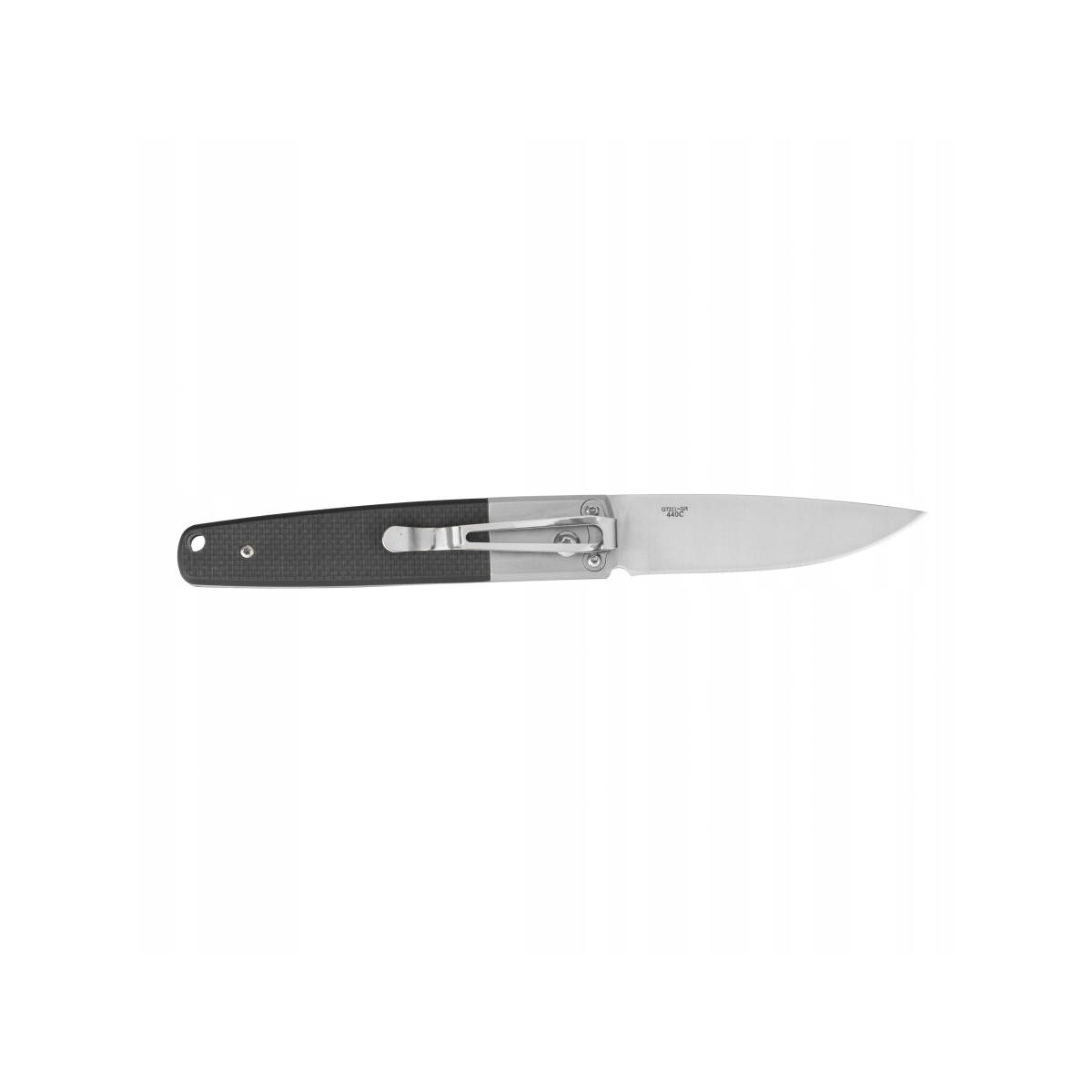 - Rękojeść to solidne połączenie stalowych przekładek z mocno teksturowanymi okładzinami wykonanymi z kompozytu o nazwie G10. Nóż posiada konstrukcję otwartą, co umożliwia łatwe utrzymanie modelu w czystości.