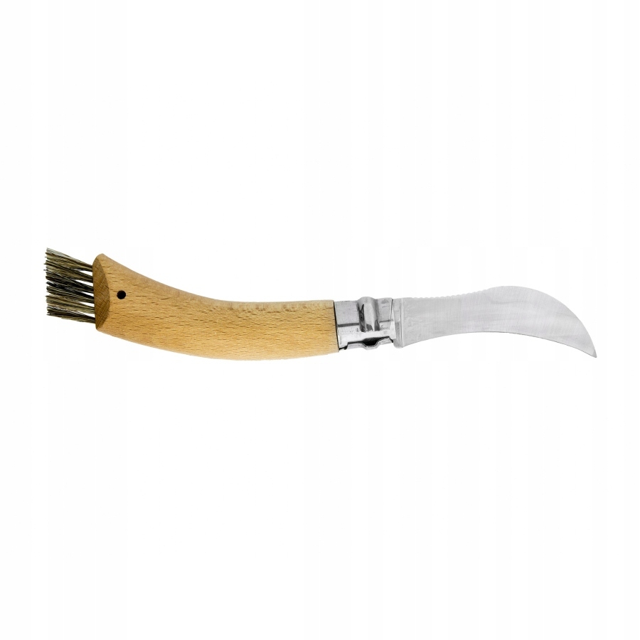 Profesjonalny nóż dla miłośników zbierania grzybów, wyposażony w sierpowate ostrze i pędzelek do oczyszczania grzybów.