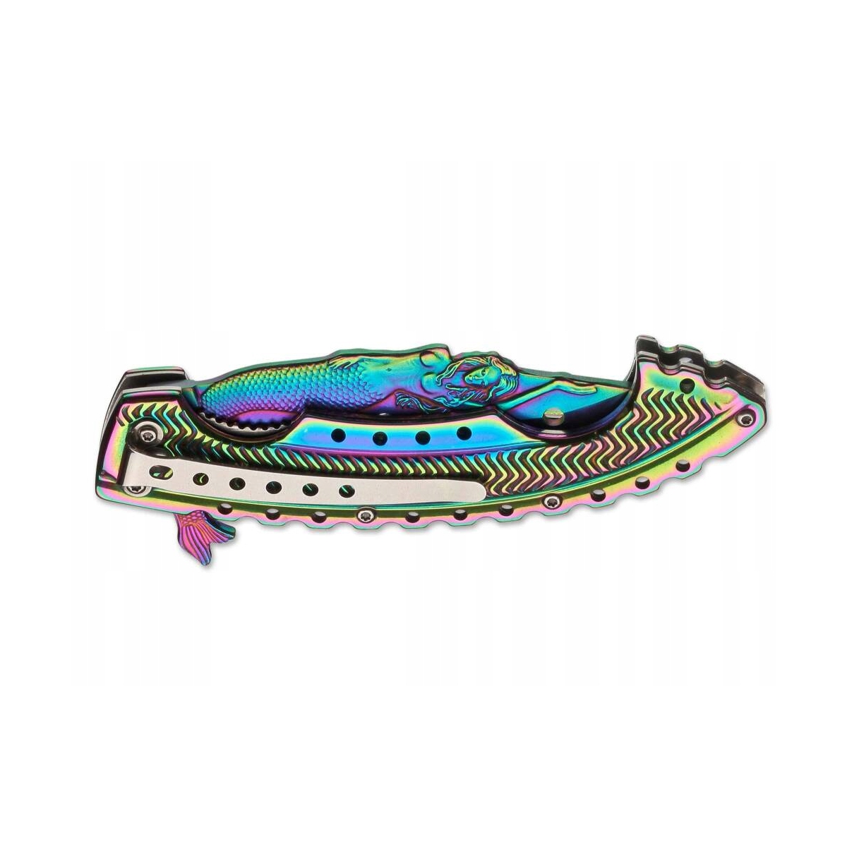 Nóż Boker Magnum Rainbow Mermaid - legendarny scyzoryk , pomysłowo ozdobiony mistycznym stworzeniem oceanicznym. Ostrze wykonane jest ze stali nierdzewnej 440A i podobnie jak ergonomicznie ukształtowana rękojeść wykończone jest w kolorach tęczy. Bardzo szczegółowa syrena zdobi tył ostrza jak figura na dziobie statku, utrzymując nóż zawsze na kursie. Okrągłe wycięcia w ostrzu przypominają bąbelki powietrza unoszące się z głębin oceanu.