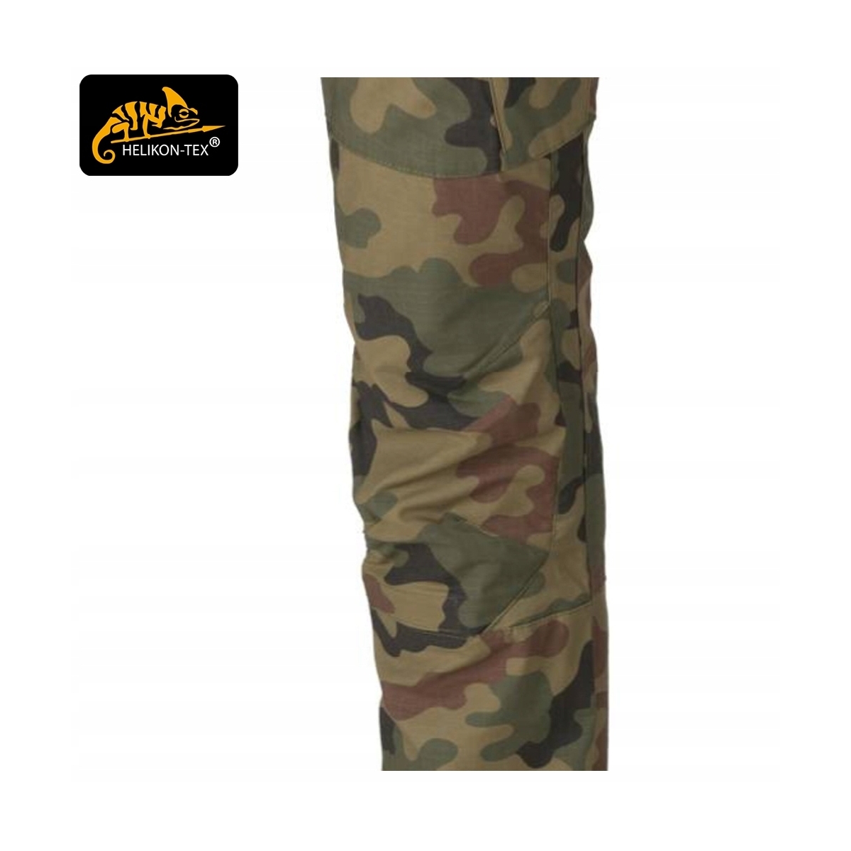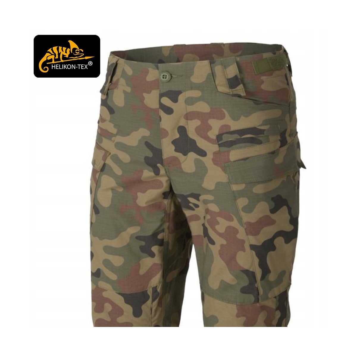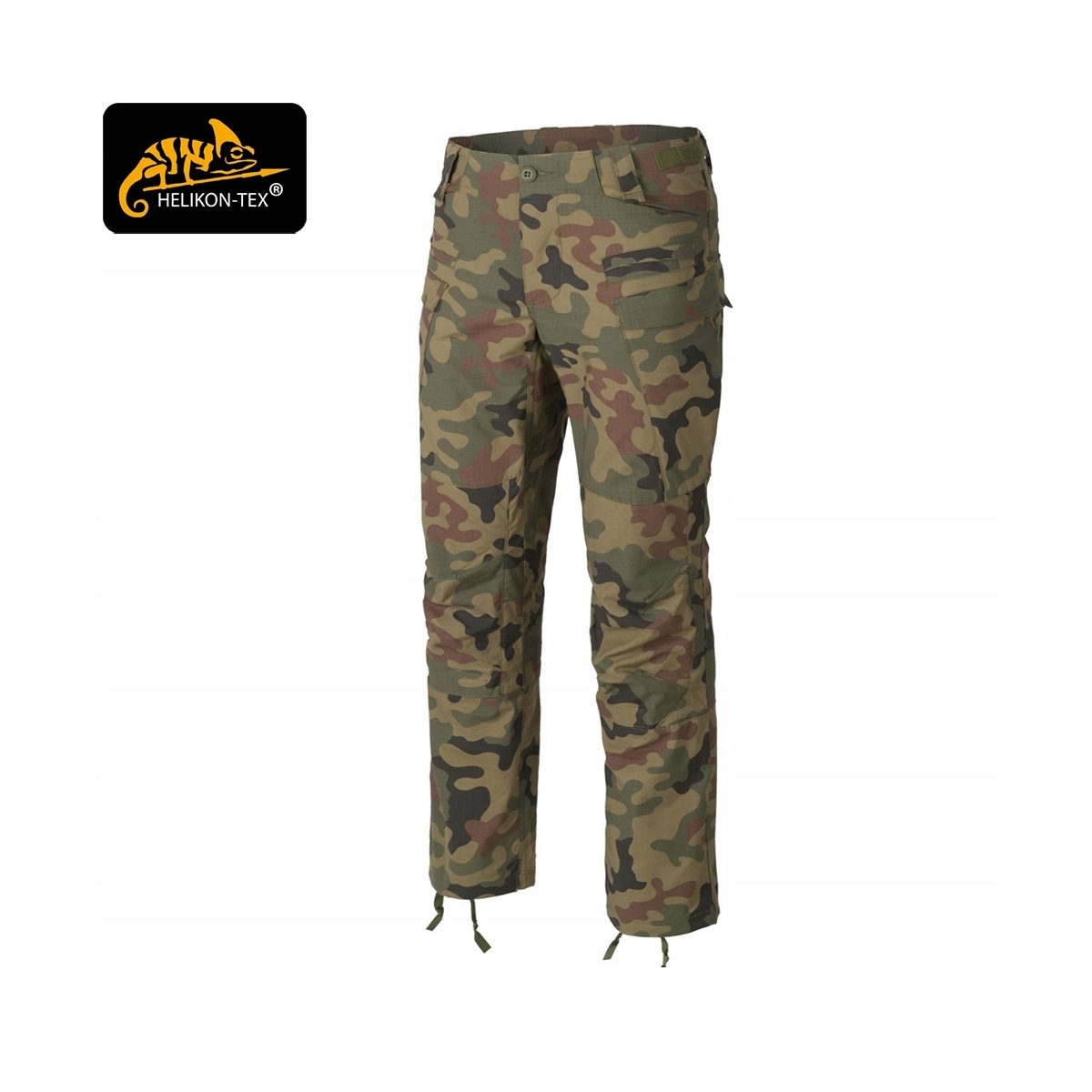 Profilowane wzmocnienia na kolanach mogą również posłużyć do przenoszenia wewnętrznych wkładek ochronnych. Spodnie zapinane są na guziki z logo Helikon-Tex®, natomiast w talii regulowane są za pomocą taśm z rzepami.