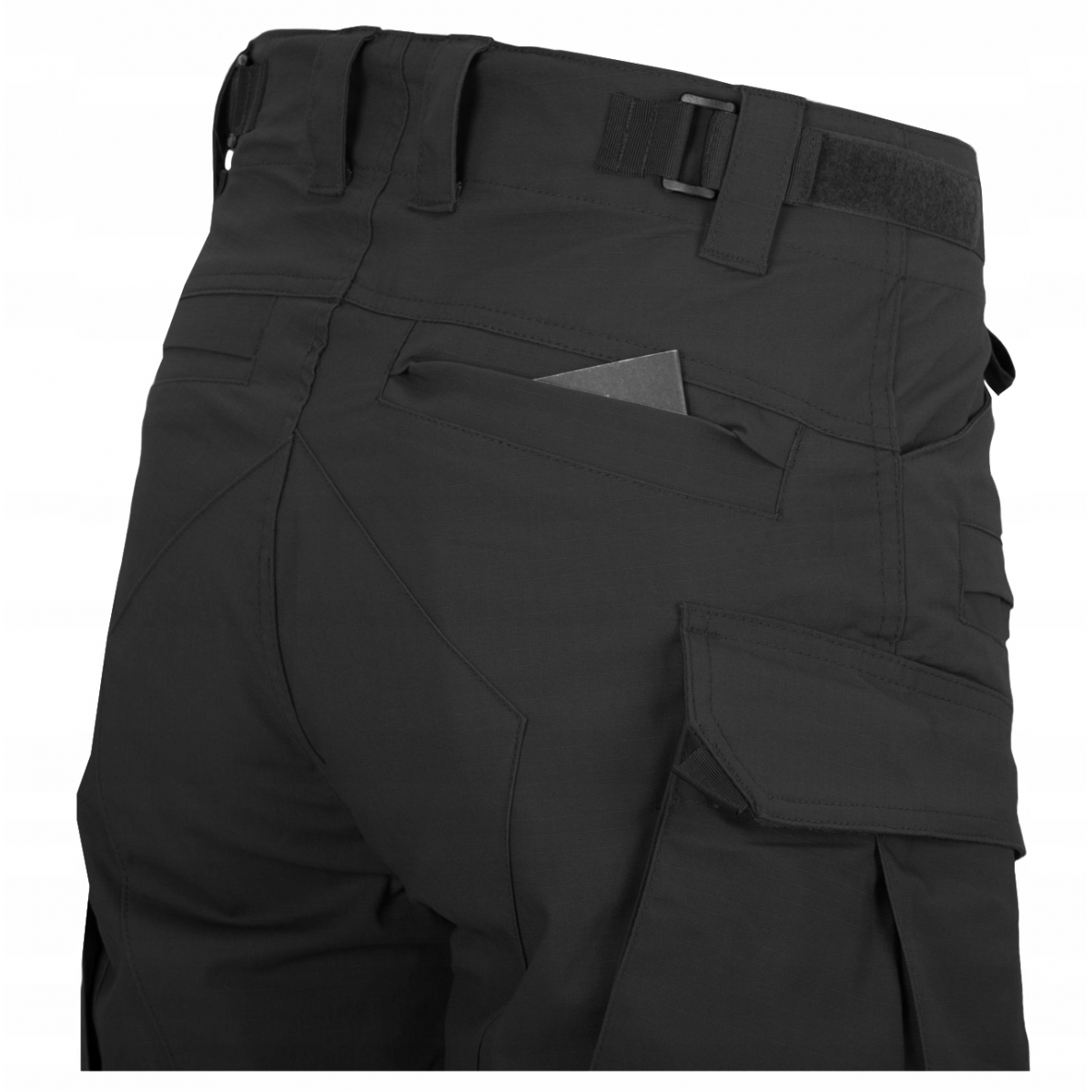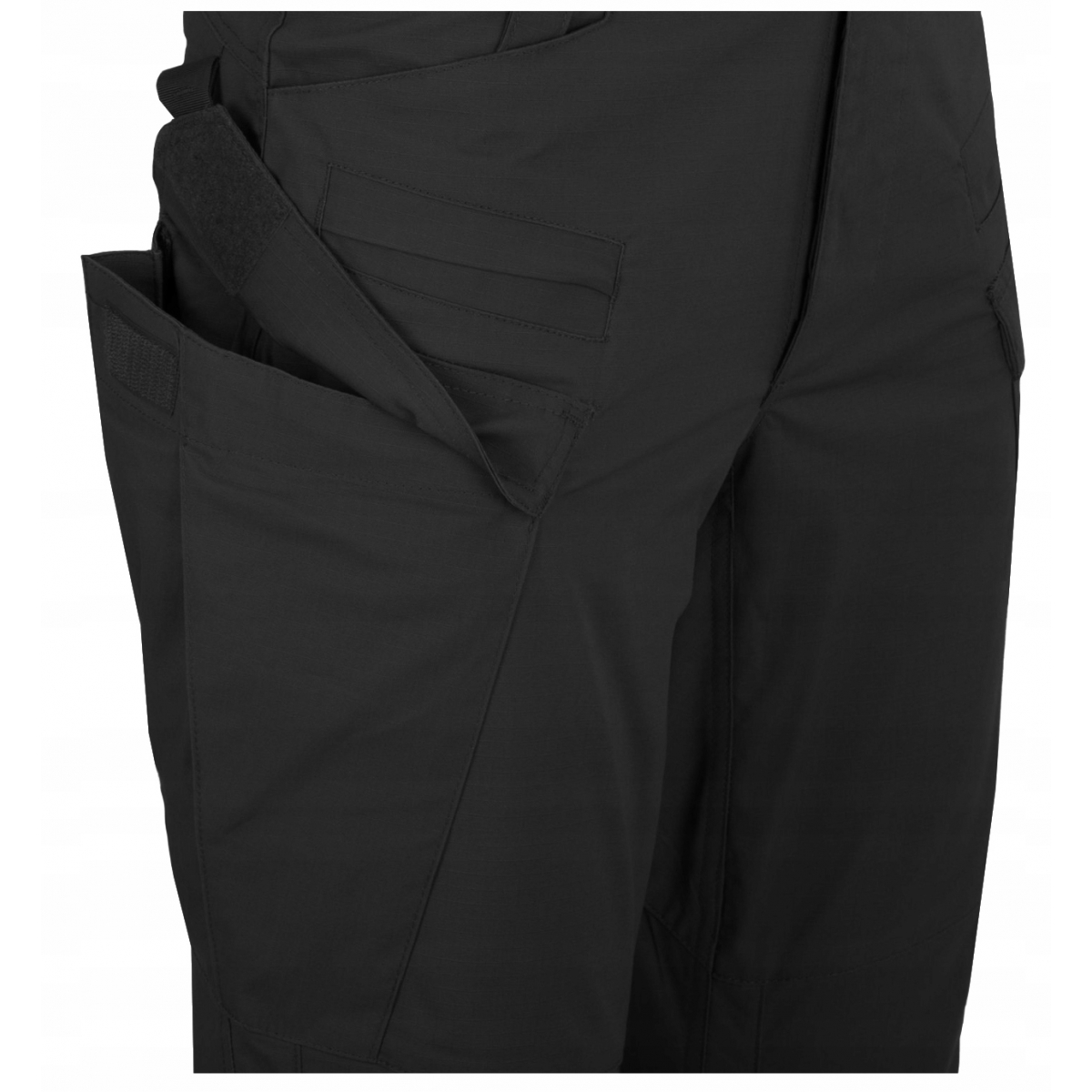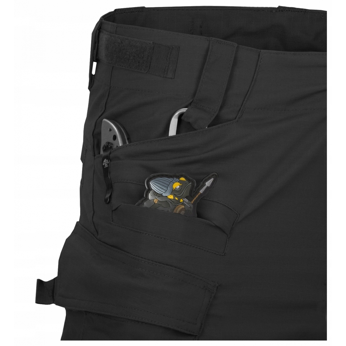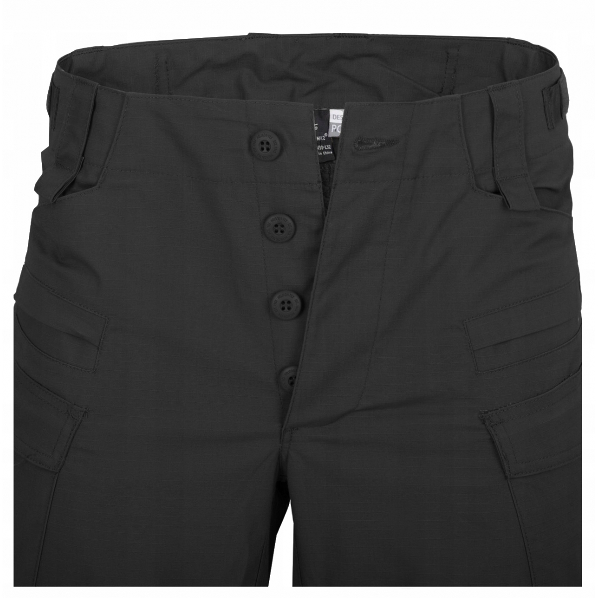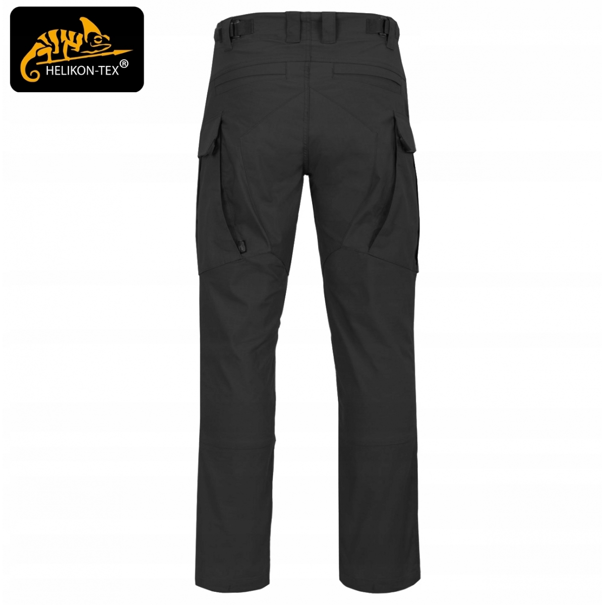 Profilowane wzmocnienia na kolanach mogą również posłużyć do przenoszenia wewnętrznych wkładek ochronnych. Spodnie zapinane są na guziki z logo Helikon-Tex®, natomiast w talii regulowane są za pomocą taśm z rzepami.