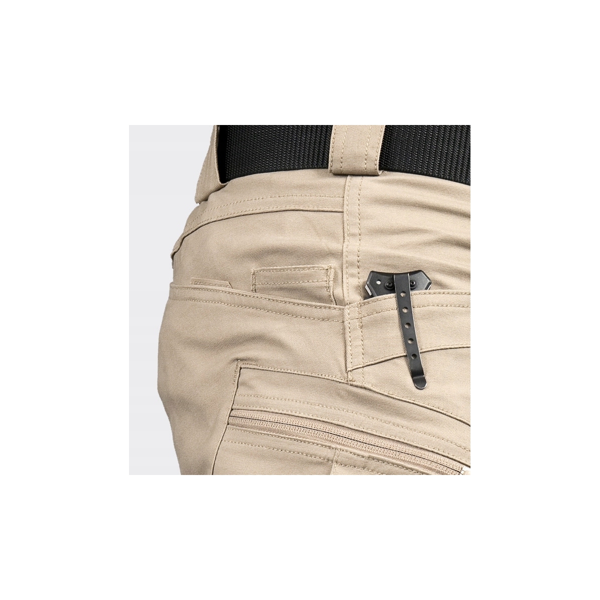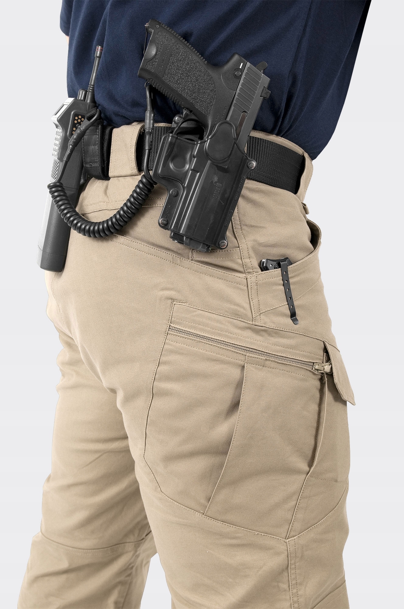 - Dwie wąskie kieszenie wkomponowane w kieszenie tylne, na magazynki lub pałkę teleskopową.