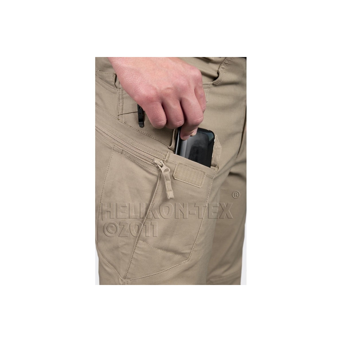 - Dwie kieszenie udowe zapinane zamkiem YKK® (odwrotnym), mogące służyć do przenoszenia dokumentów i drobnych przedmiotów osobistych