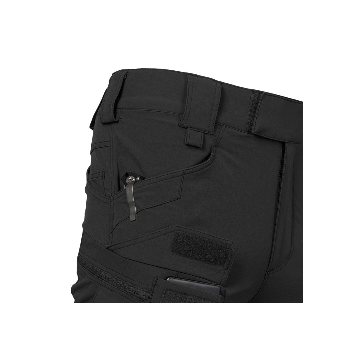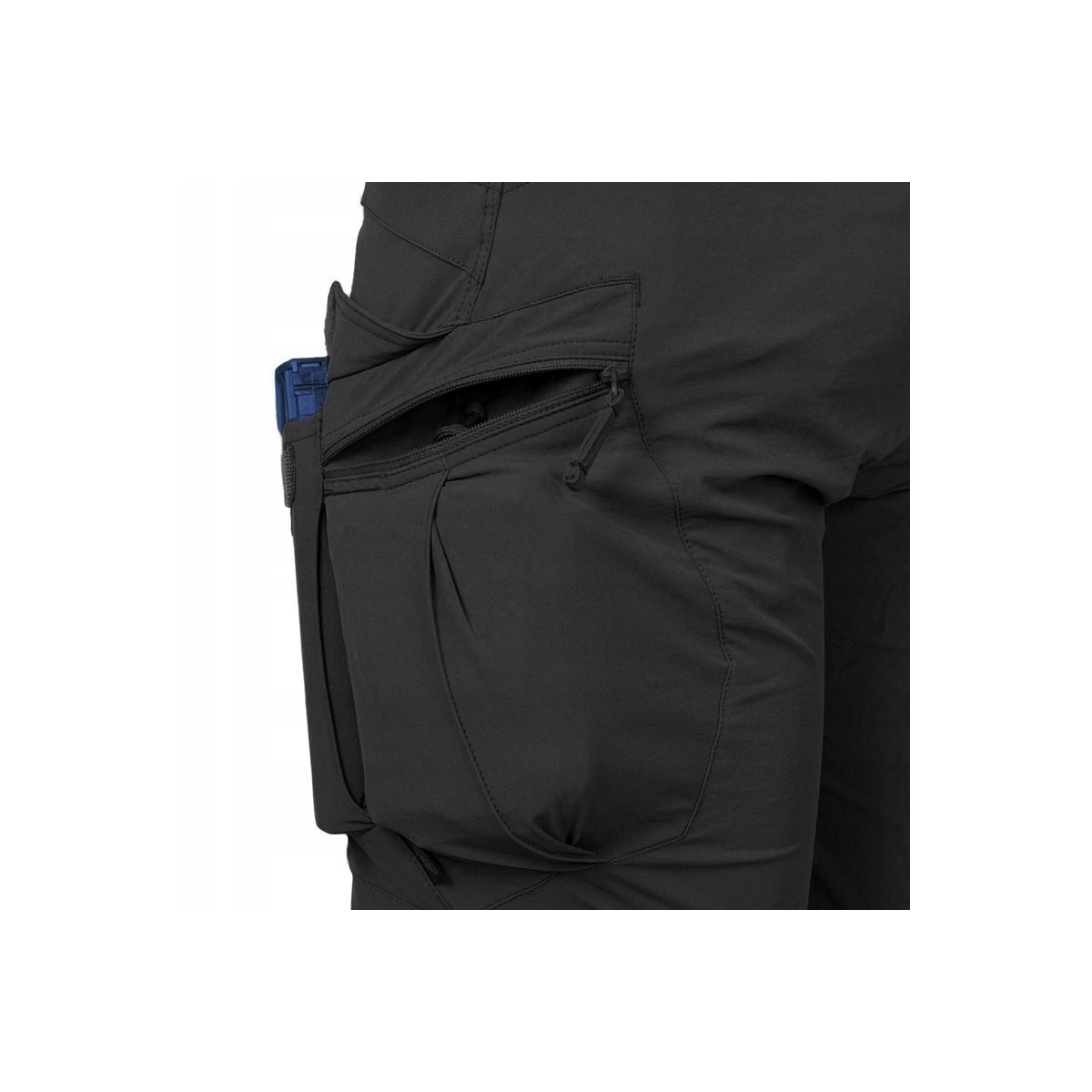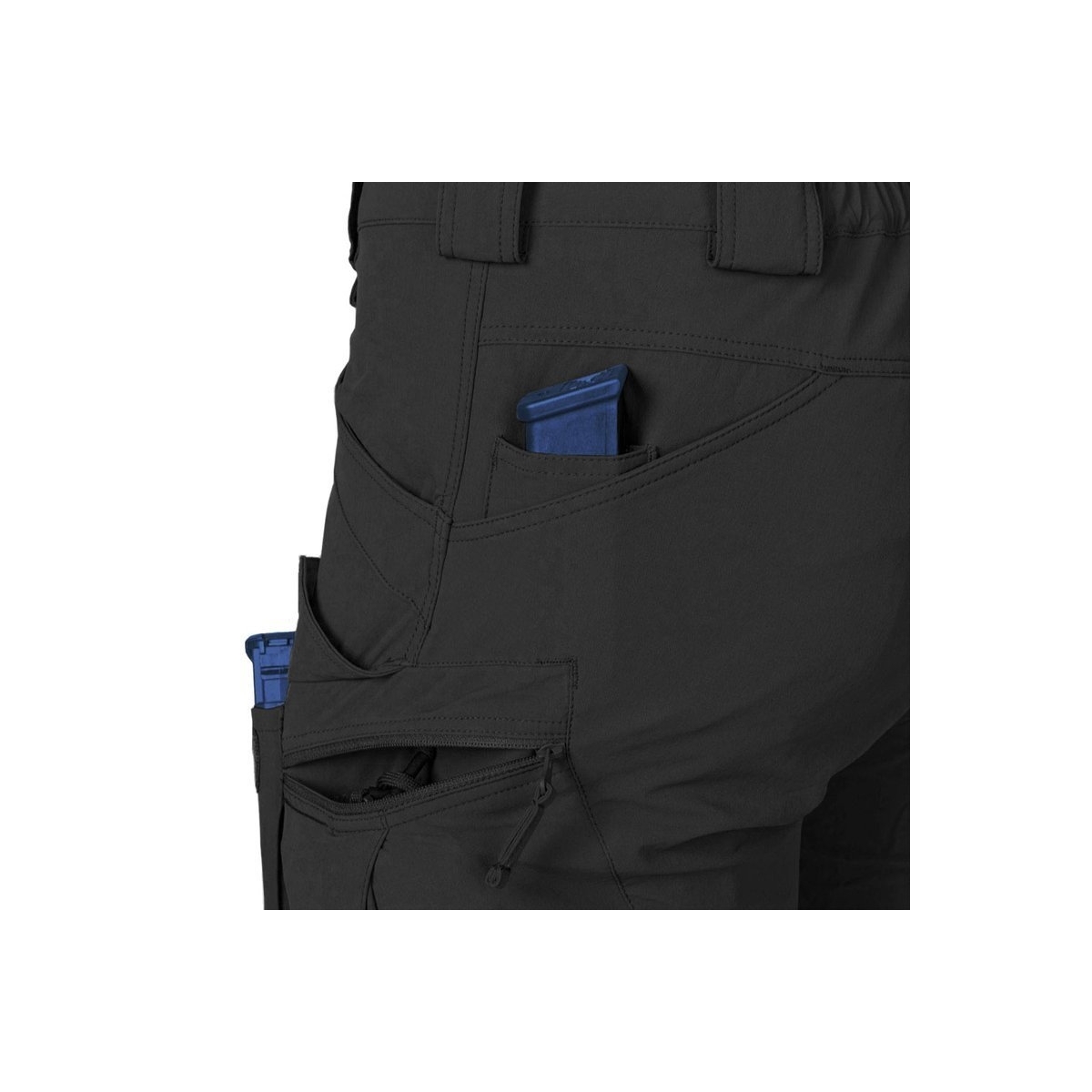 - Dwie wąskie kieszenie wkomponowane w kieszenie tylne, na magazynki lub pałkę teleskopową. Możliwość zwiększenia głębokości kieszeni