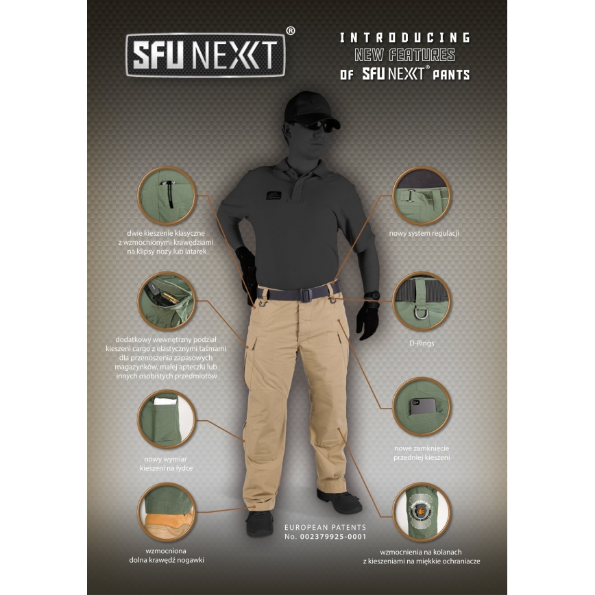 Spodnie taktyczne Helikon SFU Next SP-SFN-PR-04 - spodnie z ulepszonej serii SFU (Special Forces Uniform) łączą w sobie wygodny, anatomiczny krój oraz klasyczny wygląd. Zawierają 9 kieszeni umożliwiających wygodne przenoszenie ekwipunku. Dodatkowo spodnie SFU NEXT posiadają wzmocnienia na pośladkach oraz na wysokości kolan. Znajdują się tu także kieszenie na miękkie ochraniacze.