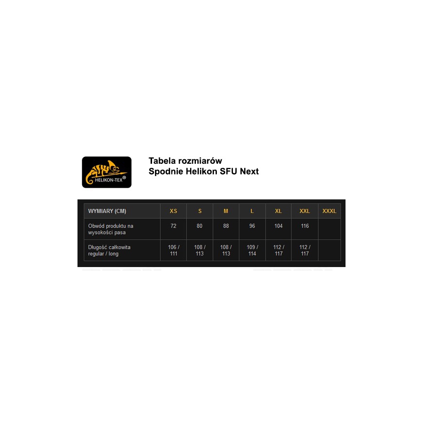 Spodnie taktyczne Helikon SFU Next SP-SFN-PR-11 - spodnie z ulepszonej serii SFU (Special Forces Uniform) łączą w sobie wygodny, anatomiczny krój oraz klasyczny wygląd. Zawierają 9 kieszeni umożliwiających wygodne przenoszenie ekwipunku. Dodatkowo spodnie SFU NEXT posiadają wzmocnienia na pośladkach oraz na wysokości kolan. Znajdują się tu także kieszenie na miękkie ochraniacze.