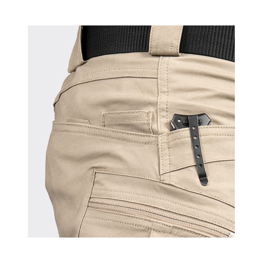 - Dwie wąskie kieszenie wkomponowane w kieszenie tylne, na magazynki lub pałkę teleskopową.
