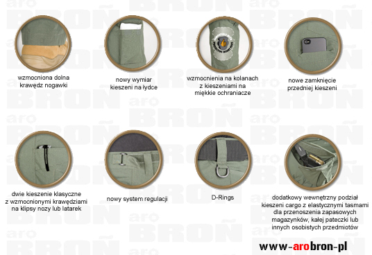 Spodnie wykonano z wysokiej jakości materiału PoliCotton RipStop (60% bawełna, 40% poliester), który charakteryzuje się dużą wytrzymałością oraz jest lżejszy i schnie szybciej.